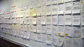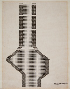 Unaccompanied by the digital reproductions of commissioned drawings which usually complement the work, this evocation of Form Letters was visually stark: standing alone as an overwhelming grid, with all of the references that it entails – to mathematics, technology, Modernism, historical painting, weaving, social control, the built environment of the city… A visible and knowable system, oscillating between a feeling of comfort and one of smothering constraint. The typed document is also a gridded space, as described by Liz Kotz at the Belkin’s Concrete Poetry Symposium in February.  With its mechanically prescribed dimensions and orientation, the typed page is an ordered space which ‘dirty’concrete poems – like Steve McCaffery’s Carnival (1973) or bill bissett’s Neon-Om (1967) – subvert to their own ends. Kotz went on to inquire about the relationship between the grids of modernist and post-modernist painting, and those of the typed page in concrete poetry.  Within this focused field, Kotz is concerned with what lies Between Poetry and Painting – which is incidentally the title of the 1965 Institute of Contemporary Arts exhibition oft cited for its influence on Morris’ work – seen while he studied at the Slade, in London.