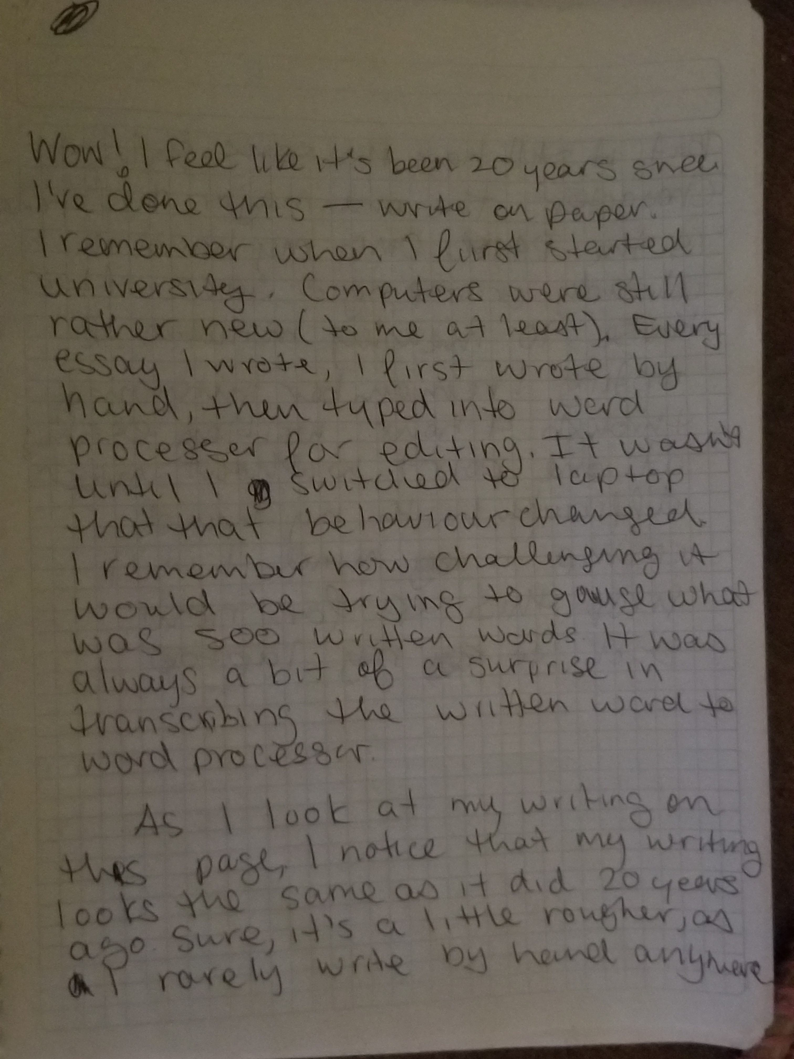For this task, we are asked to write by hand. As I never write by hand anymore, the topic of my manually written text is a reflection on the times when I used to write by hand often. Through my reflection, I realize that I have not written manually regularly for almost 20 years. I recall how as an undergrad when computers were still new to me, I used to write all my essay first drafts by hand, transcribing them later into Word. This makes me sound old. Interestingly, I am a millennial, just never had computer access until my adults years.