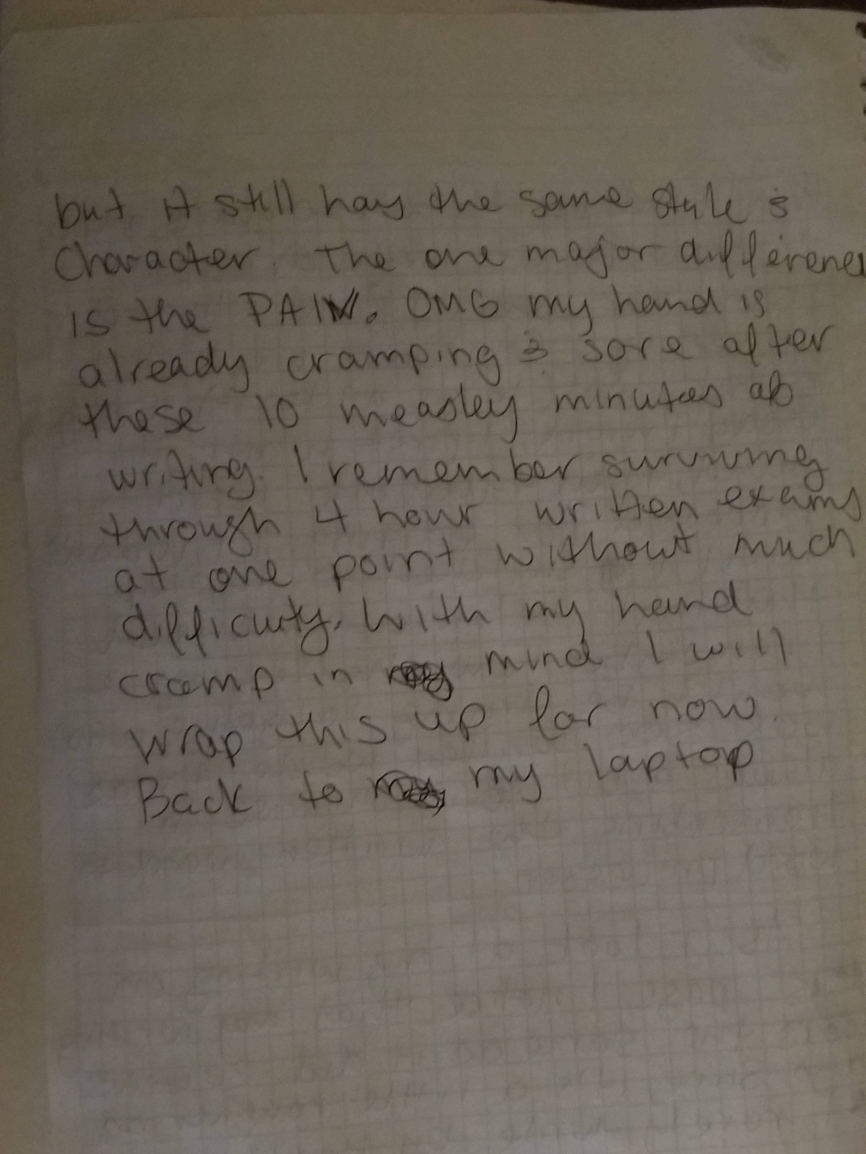 Writing itself was hard. Within minutes my hand began to cramp. By the end of the task, my hand was so sore, it reminded me of the lack of sensation my hands would have after massive 3-4 hour essay exams of my undergrad years. The pain was not a pleasant experience.