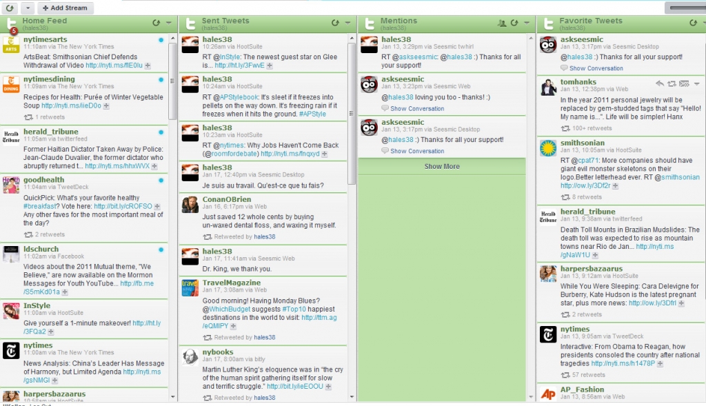 As soon as you register on Twitter, register on ( Hootsuite ) you can add in your profile the social media networks that you want to work with. Then you can create a message to upload in your social networks at the same time or in some of them. You can also chose to create a new colume to see another social network or answer the twitts by clicking on (“Retweet”) button.
