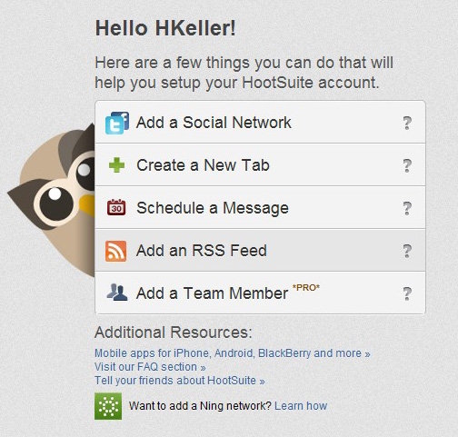 In the Hootsuite dashboard we see the main navigation tool which gives you 5 main options.