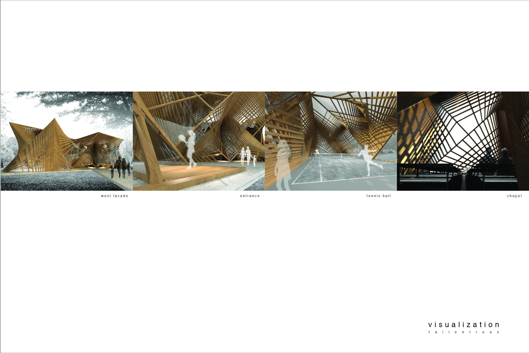 The design seeks to demonstrate the flexibility of the hypar shell by developing surfaces that not only serves as canopies but also skin. The premise of the design is a consistent architectural syntax, a singular triangular hypar module. Flipping, rotating and translating the module to establish unique volumes which envelop the spatial needs of a tennis court, a chapel and auxiliary spaces. The varying structural members also provide the potential to control daylight exposure in relation to the needs of the program.