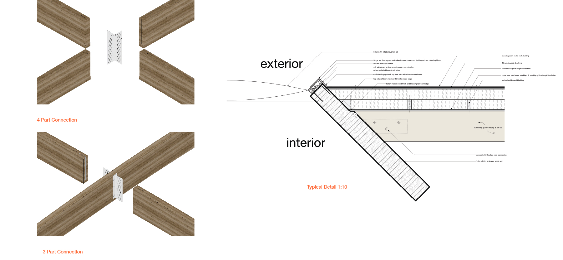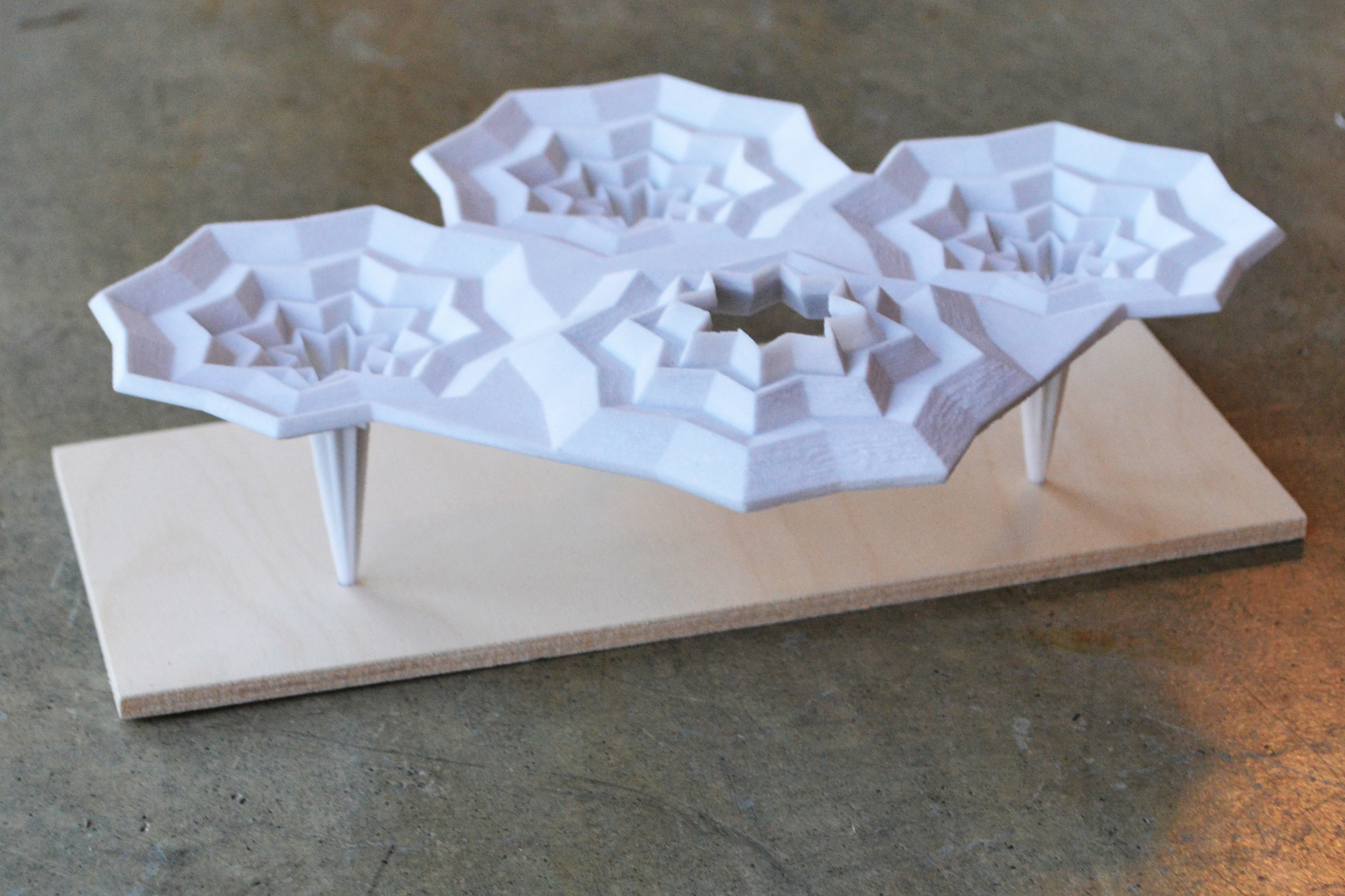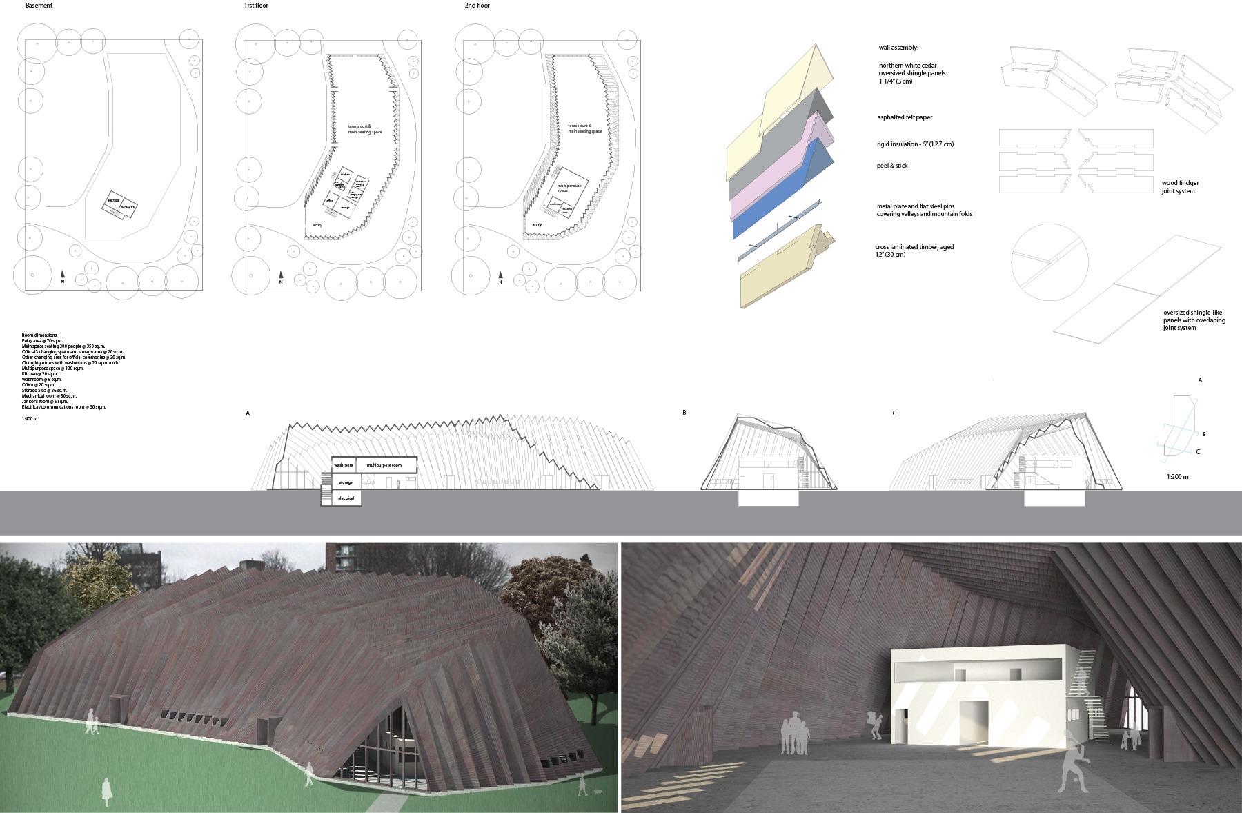 Folded plate structures create an opportunity in timber construction by utilizing manufactured wood panels, recycled material, and contemporary machining processes in a way that allows for light weight prefabricated structures. This project celebrates the beauty and opportunity inherent in the material while challenging the perceived limitations of wood. Through radial symmetry a field of column structures is both modular and systematic in the way it carries the building load to the ground. Concurrently the system performs a series of building tasks, such as passive day lighting and rain water harvesting, while achieving a unique spaceĀ for community and celebration.