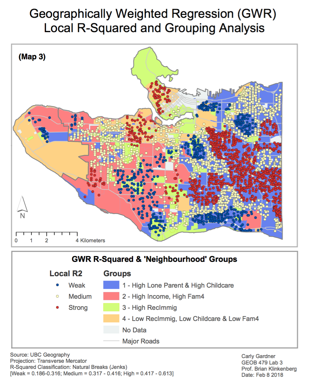 When overlaid by the local R-squared results generated by the GWR regression, there appear to be certain neighbourhoods of Vancouver which display a strong correlation with social scores (Map 3). These neighbourhoods were generated by a grouping analysis that combined regions of similar traits.