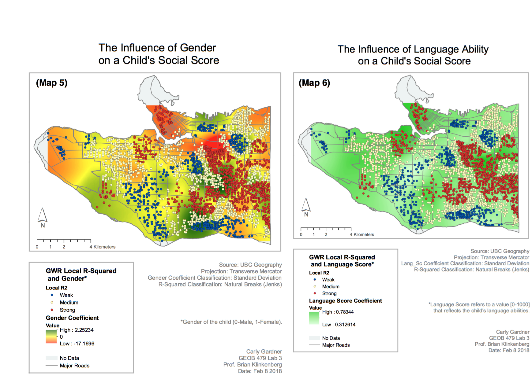 In this lab, we explored the relation between a child’s social skills and various socio-demographic variables related to the child and to their neighbourhood. First, we began with an explanatory regression analysis to determine which variables (average income, gender, and language ability) had the strongest relationship with children’s social scores.