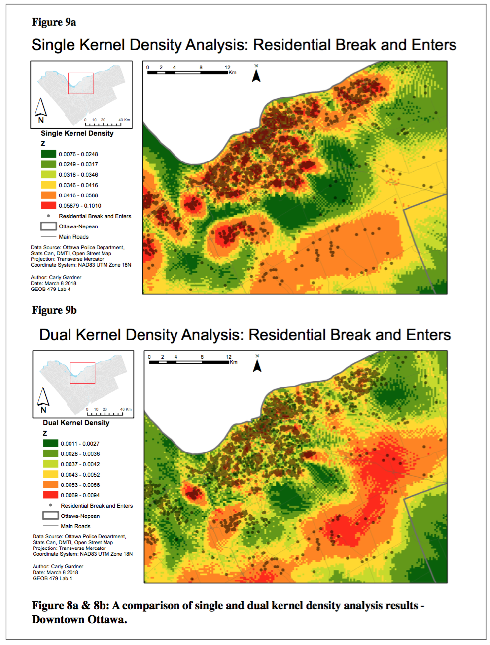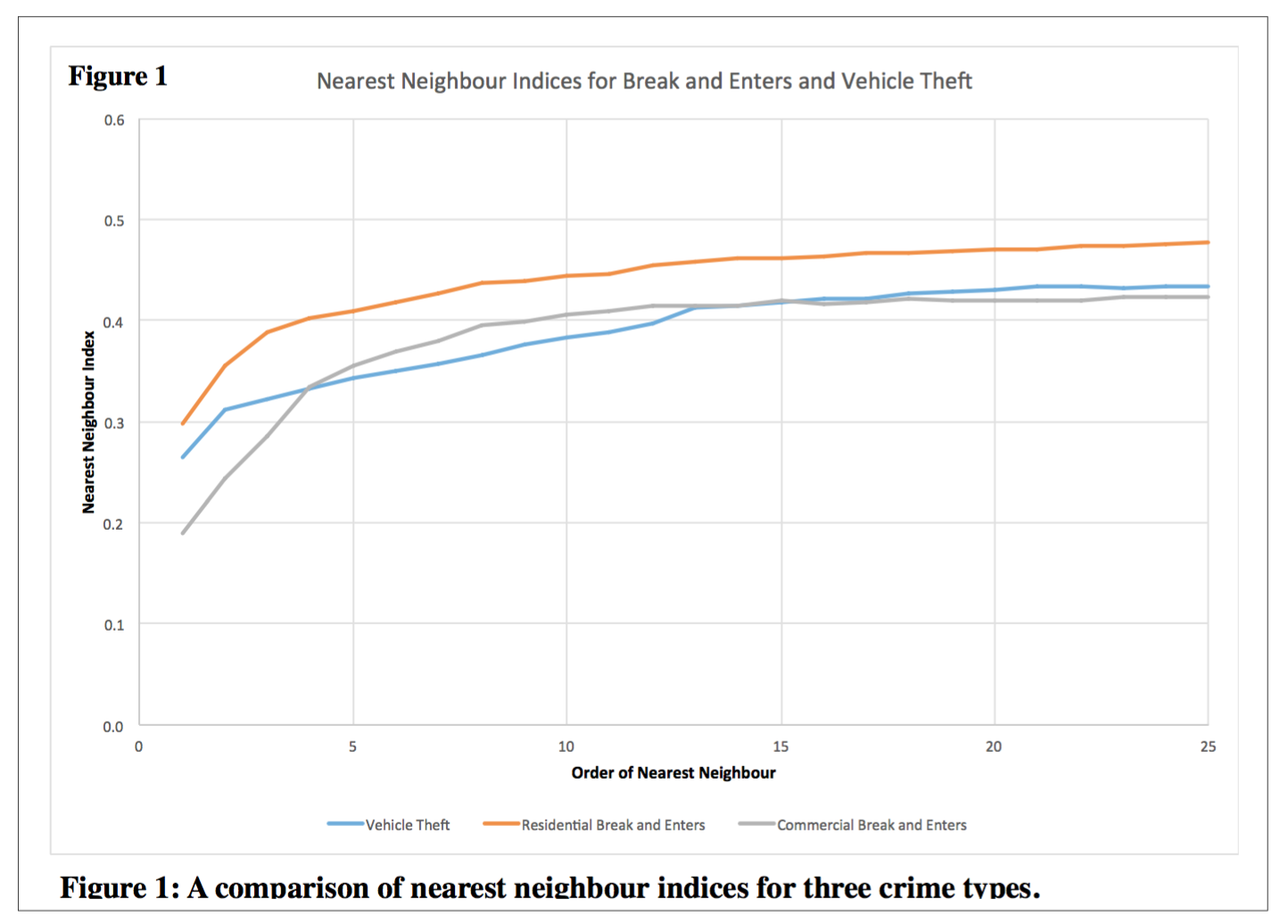 CrimeStat was used to produce nearest neighbour statistics, which can be used to determine if patterns of crime activity show evidence of clustering or dispersal. All index results had a value lower than 1.0, which indicates that all three variables demonstrate clustering. Spatial clustering may be a result of municipal zoning laws. Commercial districts may be restricted to certain areas of the city; therefore, commercial break and enters will be close to each other. In contrast, residential break and enters are least spatially aggregated. Residential areas cover a larger portion of the city, so generally speaking, a ‘smart’ criminal in a residential area would space their crimes further apart to avoid being caught.