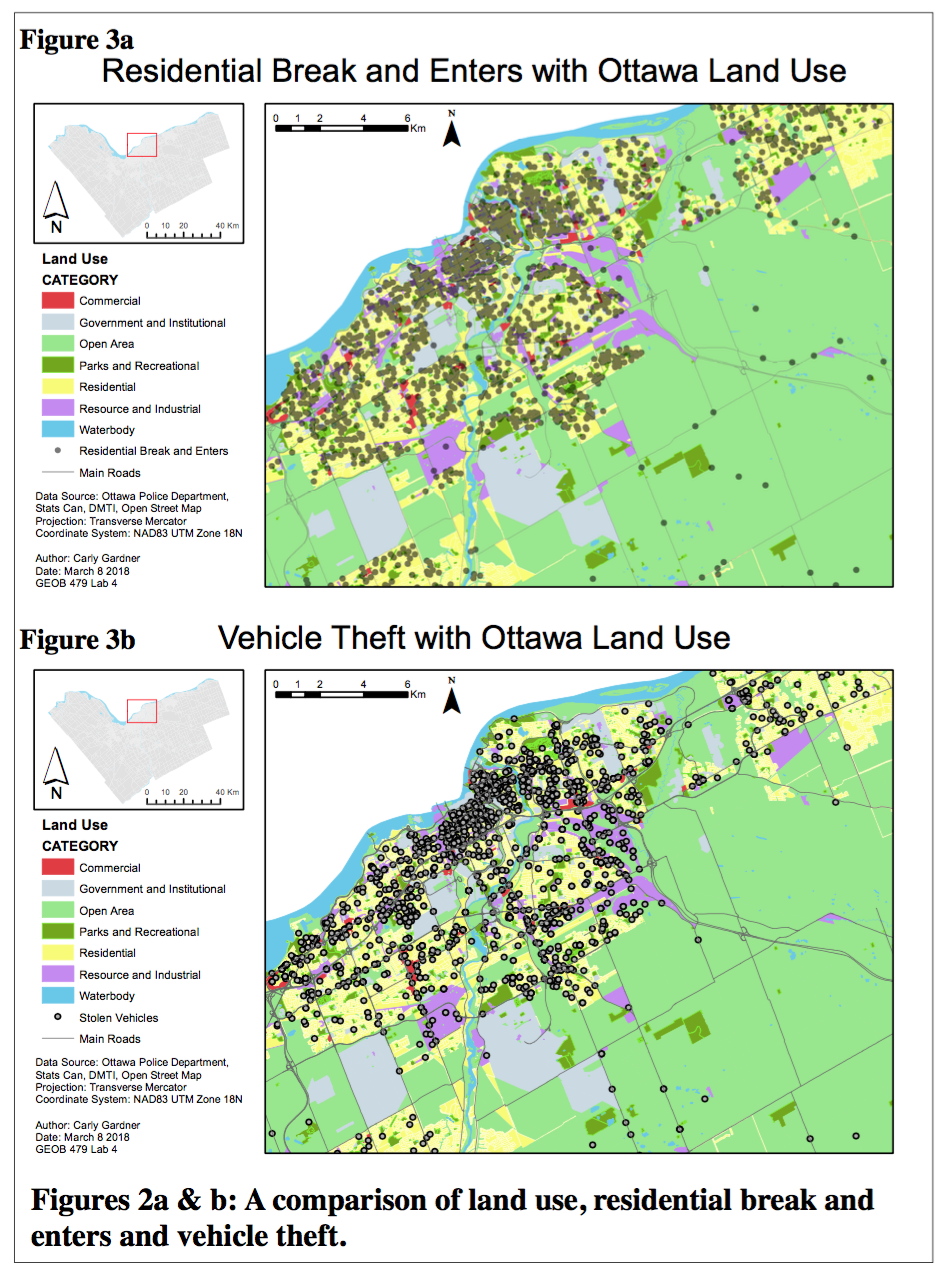 For this lab, the spatial relationships of crimes in Ottawa, Ontario were analyzed using a series of CrimeStat tests and ArcGIS mapping. We focused on automobile theft, commercial and residential break and enters. CrimeStat tests generated nearest neighbour and Moran’s I indices. ArcGIS was used to map crime spatial relationships visually using fuzzy more, nearest neighbour hierarchical clustering, and kernel density functions. The Knox index was used to compare the temporal relationships between car thefts and space.