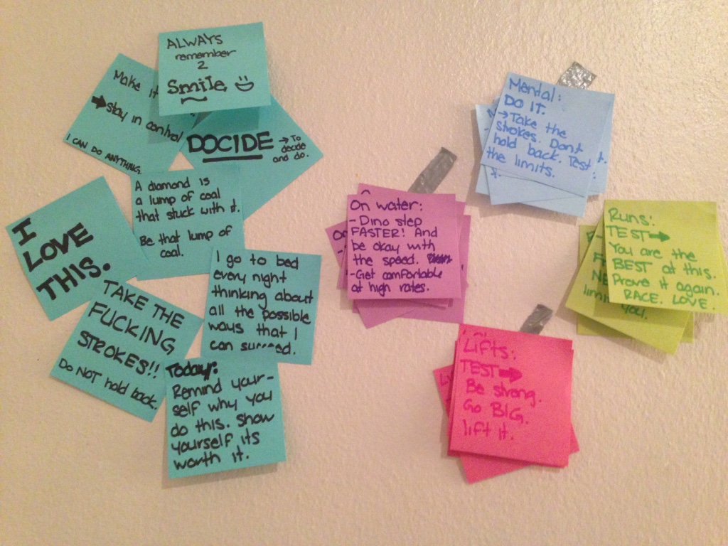 But wait… wouldn’t it be better to be occupied with finding ways to help those who are putting in all the extra effort and are fully committed? They are the ones who set themselves apart from the group. They are the ones working hardest. Should I not be working hardest for those working hardest for themselves? See here a collection of post-it reminders from one such athlete.