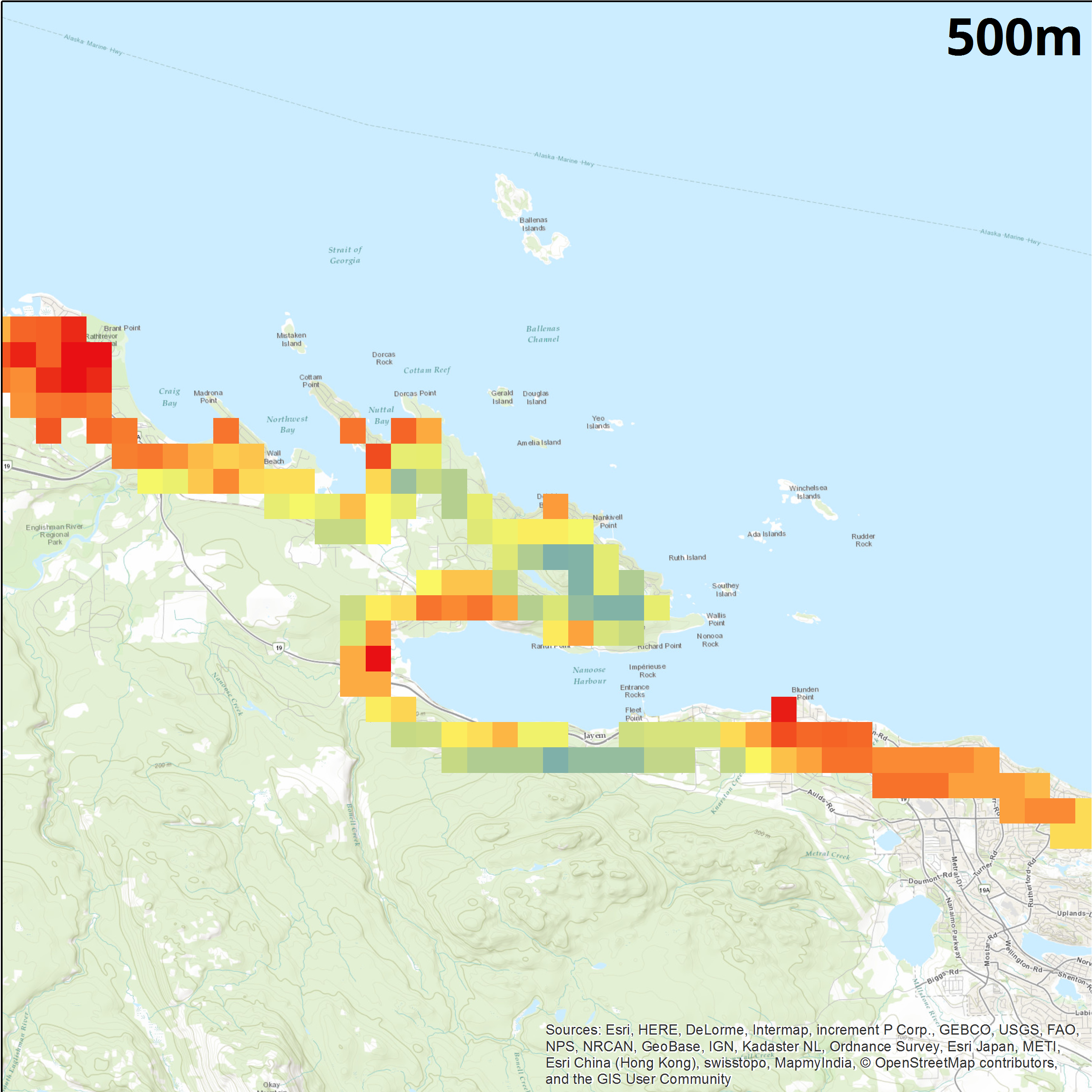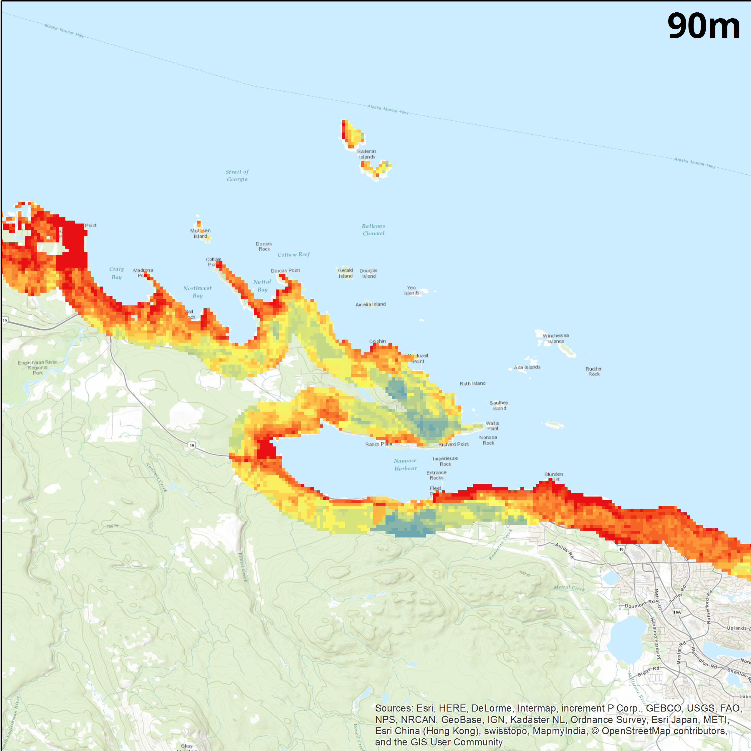 The lack of variations in variable choice between scales and the limiting of analysis to a single resolution lends itself to inaccuracies when looking at the index in finer detail. The MAUP results from the aggregation that occurs with a decrease in scale, generalizing any possible variations in data within the cell into a single value that may not be fully representative (Wong 2004). The restriction of the analyses performed to a 90m resolution precludes the model from drawing conclusions at a scale that is finer than that cell size. This is illustrated by the figures below, wherein the variations of coastal sensitivity of Nanoose Bay on Vancouver Island for the index calculated at a 90m resolution are masked when the index is calculated at a 500m cell size.