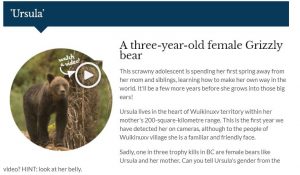 An excellent visual description and video on trophy hunting of Grizzly bear on BC’s Central Coast. I particularly appreciated the strong emphasis on the relationships between bears, people, and land. Place-based knowledge is central to understanding this important issue. Teachers should preview this 20 min video to ensure content is age-appropriate.