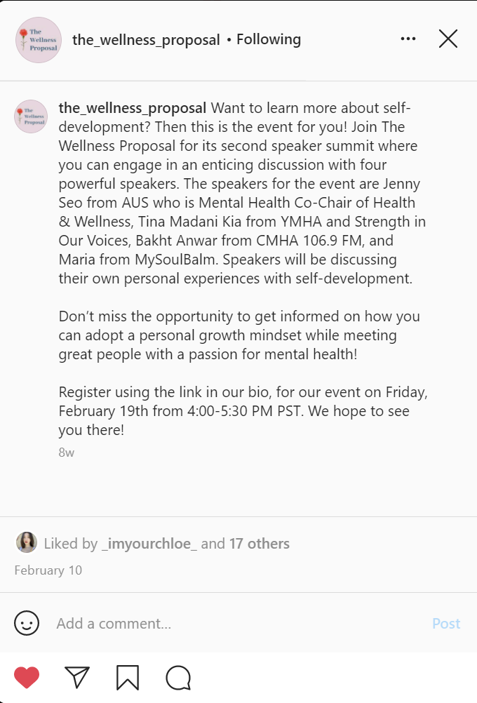 Beyond the numbers, however, we also believe that our impact lies in the way the organization may now have new ideas to take away from working with us. We also hope to have impacted individuals following the account in accordance with the goals of The Wellness Proposal; that is, we hope that the content we created were beneficial and helped to encourage mental wellness. We hope that our time with The Wellness Proposal has been especially helpful to benefiting the organization, both behind-the-scenes and for individuals.