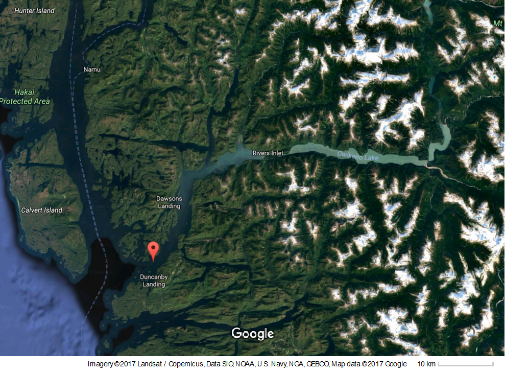 Wuikinuxv Nation is located 480 km north of Vancouver on the Pacific Central Coast of British Columbia. This territory is unceded and has been occupied by the people of Wuikinuxv for over ten thousand years. Their traditional territory extends from the top of Wuikinuxv Lake, down the Waanukv River, into what is commonly known as Rivers Inlet, to the Koeye River and Cranston Point (Stevenson, 1980). This ancestral and traditional territory is unceded, meaning that it has never been surrendered or sold to colonial governments.