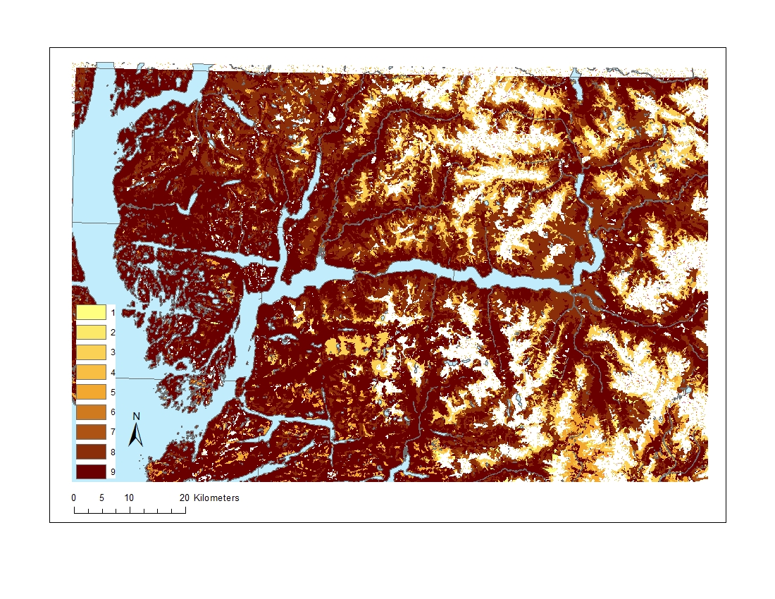 The sensitivity analysis is arguably the most important part of a multi-criteria analysis. This is because it addresses any uncertainty present in the data used in the analysis. Conducting a sensitivity analysis in an MCE involves a redistribution of factor weights in order to determine if the analysis is subject to minor changes. In conducting my sensitivity analysis, I chose to evenly weight all of the factors. The results of this show that the analysis is subject to minor changes. My weighted sum allows for a broader distribution of potential M. fusca habitat, which I feel is welcome in this analysis. For the purposes of the future of this project, having broader potential allows for more extensive ground-truthing.