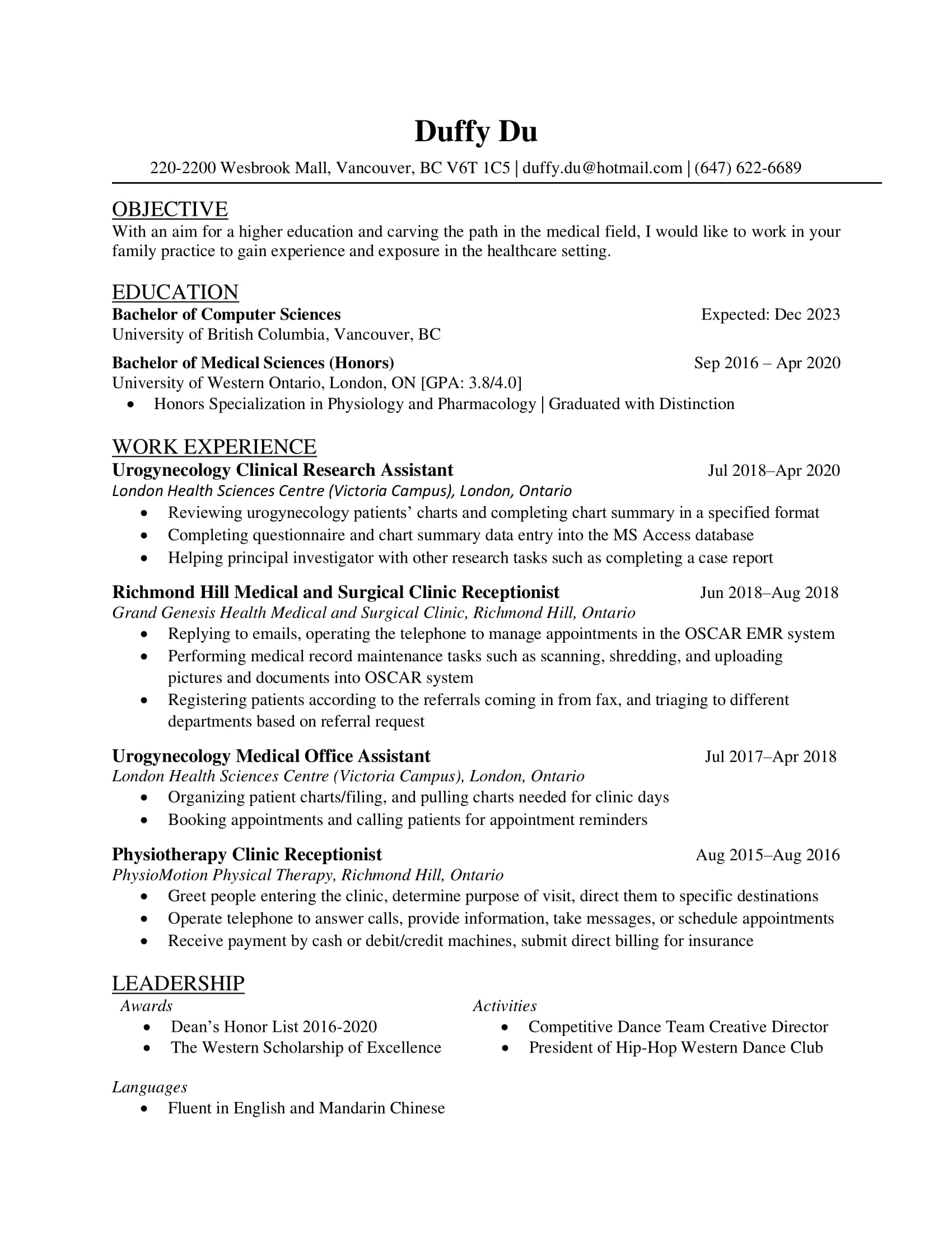 Please consider my application for the part-time medical office assistant position at your Bayswater Family Practice, as advertised on Mar 14, 2022 on University of British Columbia Careers Online Website. I am currently a third-year computer science student at University of British Columbia.