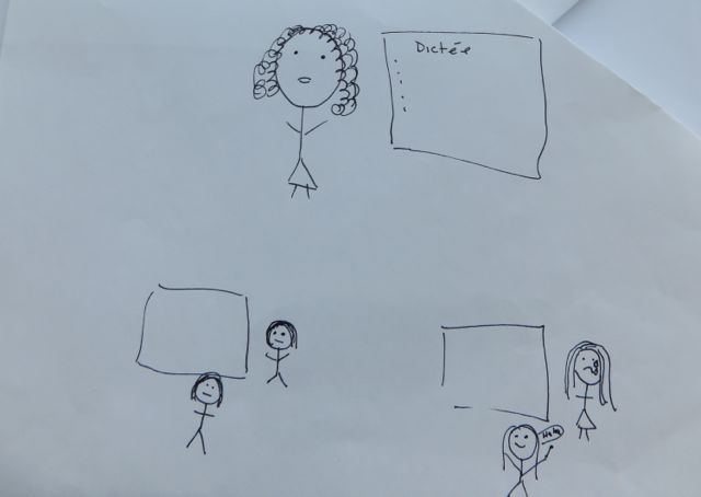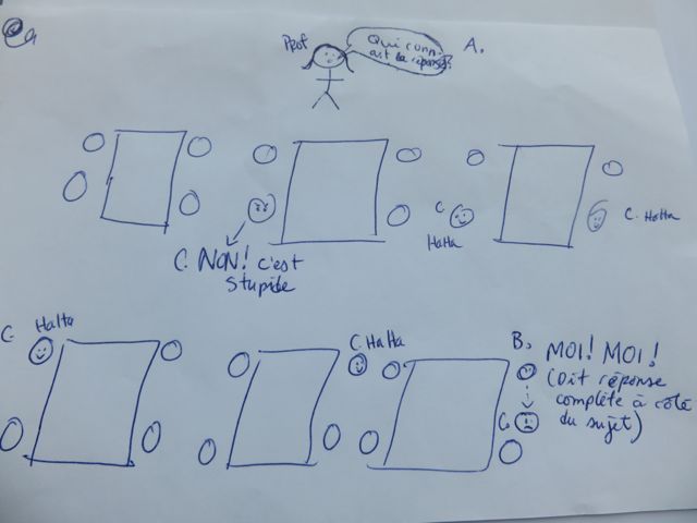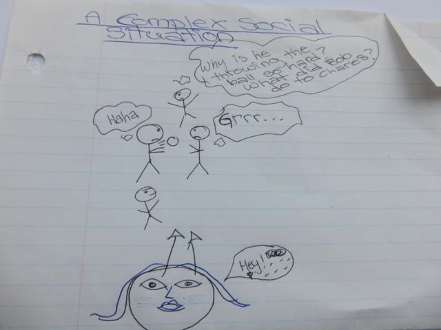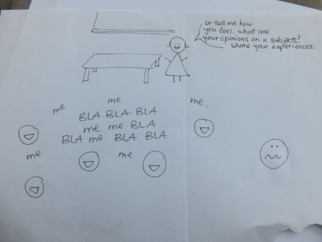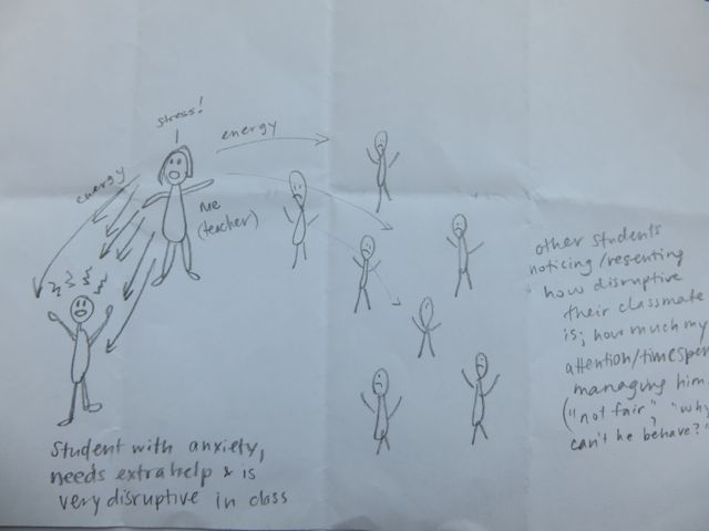 Prior to the facilitated session by Mali Bain on January 26, 2015, I asked the students to think about a situation, arising from their own teaching experience, of a challenging interpersonal situation that got in the way of learning. I then asked them to create a quick sketch of that situation in which they emphasized the social dynamics. Below you will find some of their sketches (posted here with permission):