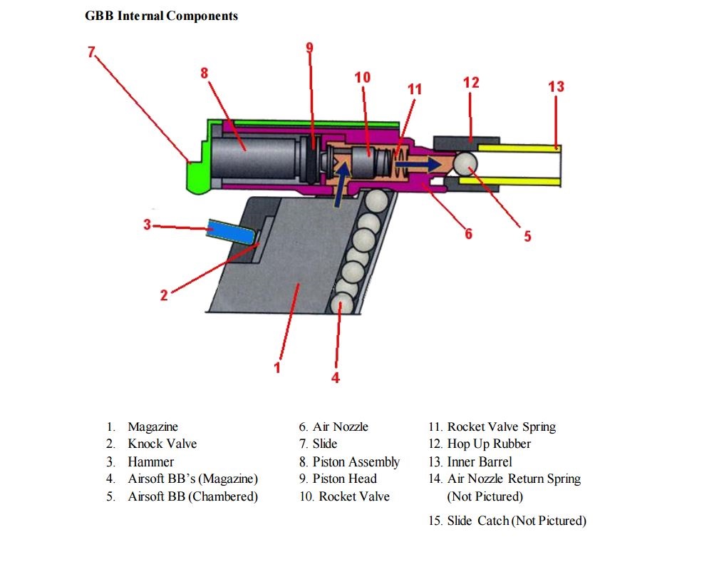 When the trigger of a gas blowback airsoft pistol is pulled, it will release the gun’s hammer and hit the knock valve, which releases compressed gas into the air nozzle. The air nozzle then funnels all of the compressed air directly onto the BB pellet held in the chamber and pushes the BB pellet out of the barrel. Upon pushing the pellet out, the remaining gas is released into the air and expands within the air nozzle, pushing the slide backward and creating the motion we know as blowback. Thus, the higher the compressed air pressure is, the higher the pellet’s velocity and blowback motion will be. Blowback can be understood as the recoil of an airsoft gun, as it operates with a similar principle and mechanism to a real firearm where an external force outside the bullet or pellet propels them forward, creating the motion we know as firing (Morawski, 2022).