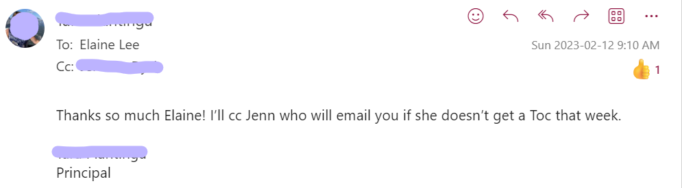 Kress (2005) raises doubts about the potential impact of emerging textual forms on a reader’s imaginative interpretations. In my opinion, I think using emoticons in writing takes away the uniqueness and personality of the writing. I frequently answer others’ text with the thumbs-up emoji to save time and sometimes even with work emails to let others know that I read the email. Here’s an example of an email from my principal, asking if I can TOC for another teacher at my school.