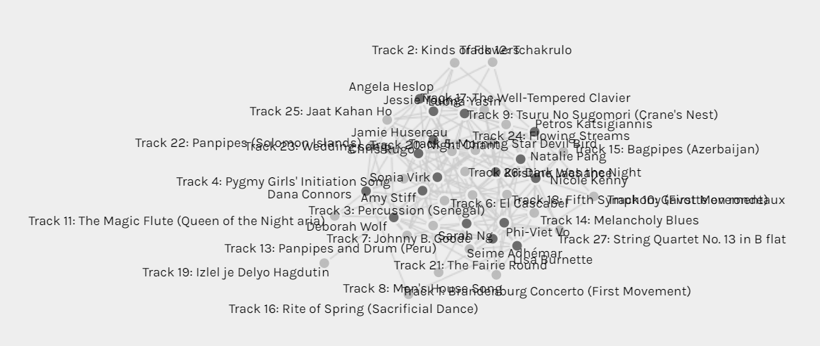 My initial focus was on music as I was interested in discovering the most popular songs. To do this, I applied the concept of connectivity from the YouTube tutorial to this context, visualizing how it might apply to the popularity of songs. When looking at the list of curated tracks, I observed that Night Chant was a popular choice with a high degree of connectivity (14 picks). Despite my intuition that this song would be well-liked, it’s worth noting that the degree of connectivity can have negative implications, as the YouTube tutorial illustrates with the example of a virus.