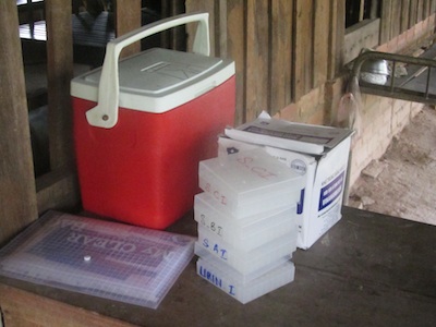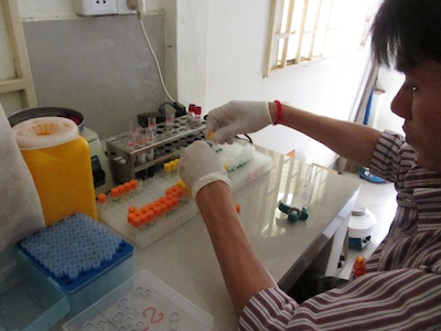 Two of the vials collected were 4.5 mL test tubes containing Ethylenediaminetetraacetic acid(EDTA), which is an anticoagulant, that prevents blood from clotting. They were then packed on ice and transported via a car we dubbed the “Blood Taxi” to the National Institute of Public Health Laboratories (NIPHL) in Phnom Penh for further processing.