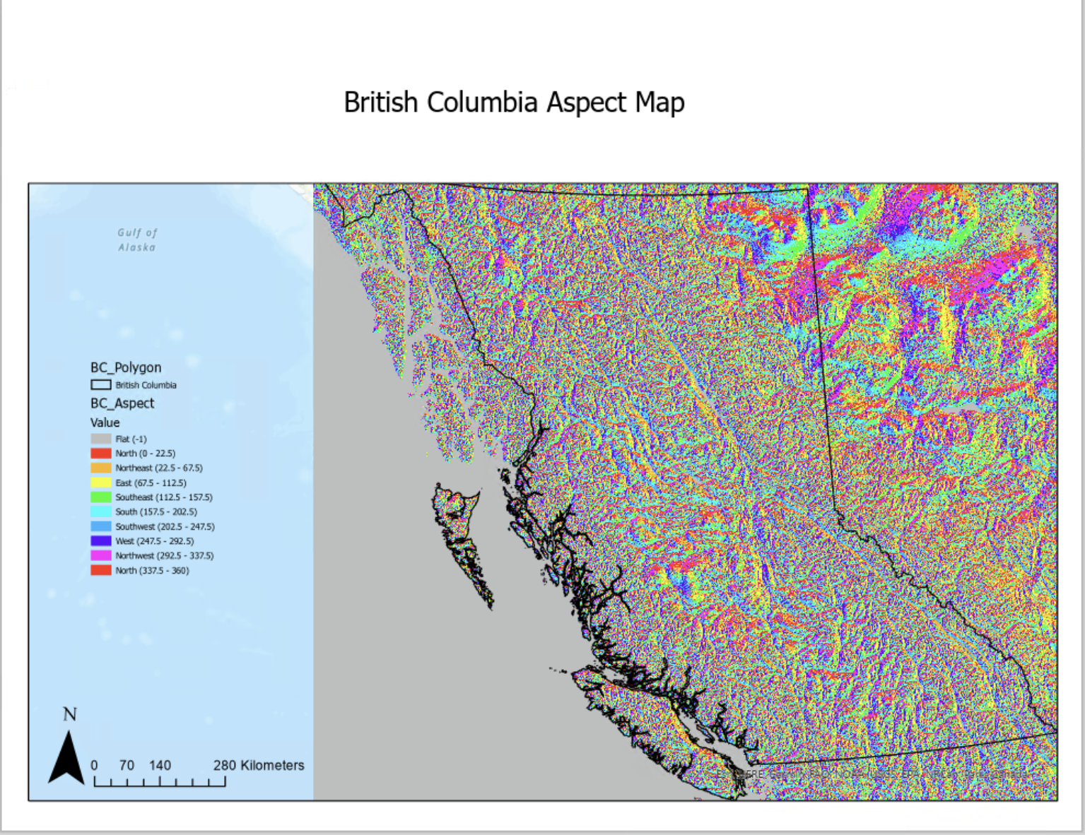 Then, using the slope and aspect geoprocessing tools, I extracted the slope and aspect data layers of British Columbia shown in Figures 2 and 3 below.