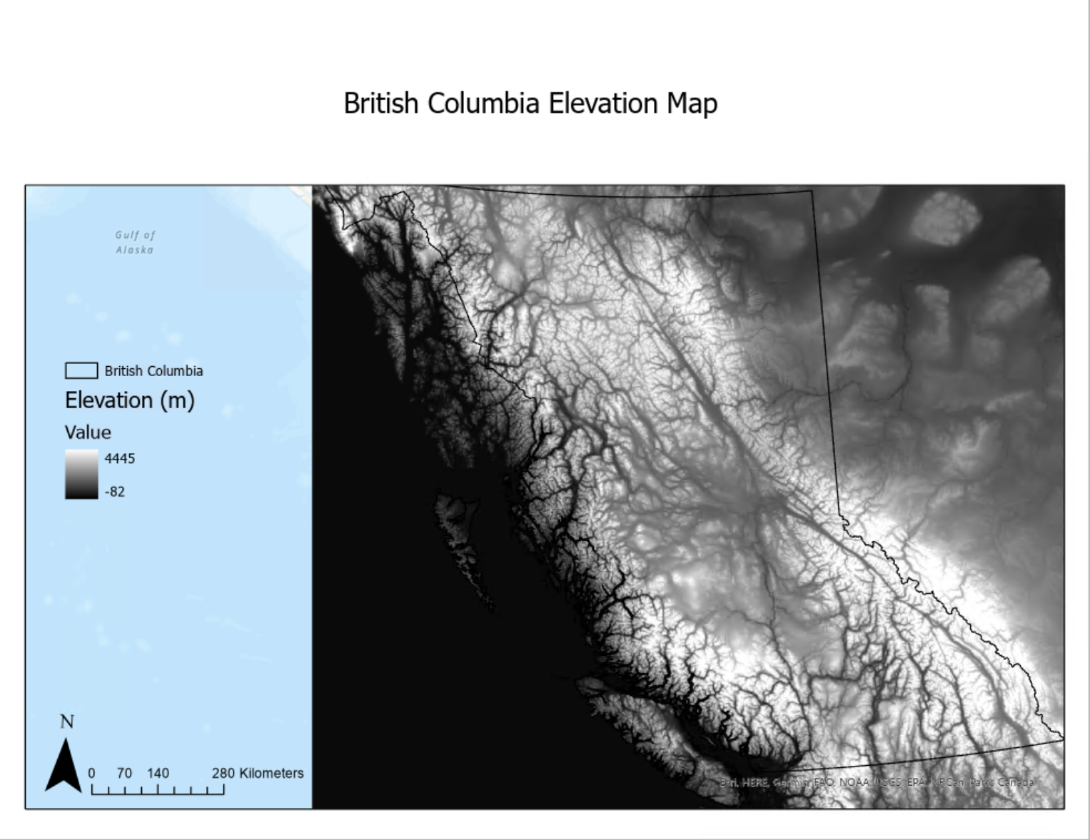 Then, creating a new feature class in the catalog pane, I traced the lines of the BC polygon layer to create the BC coast line layer, which was used to calculate Coast Distance. To do this I used the euclidean distance spatial analyst tool. Coast Distance can be seen in Figure 4 below.