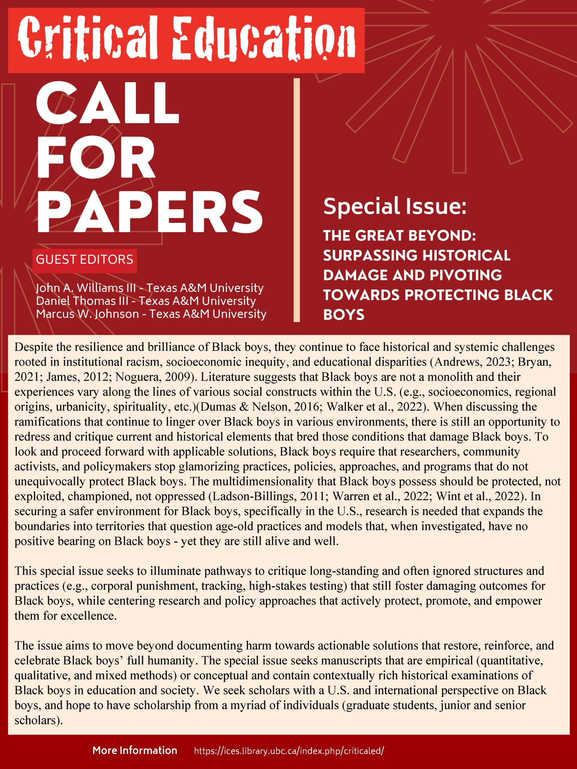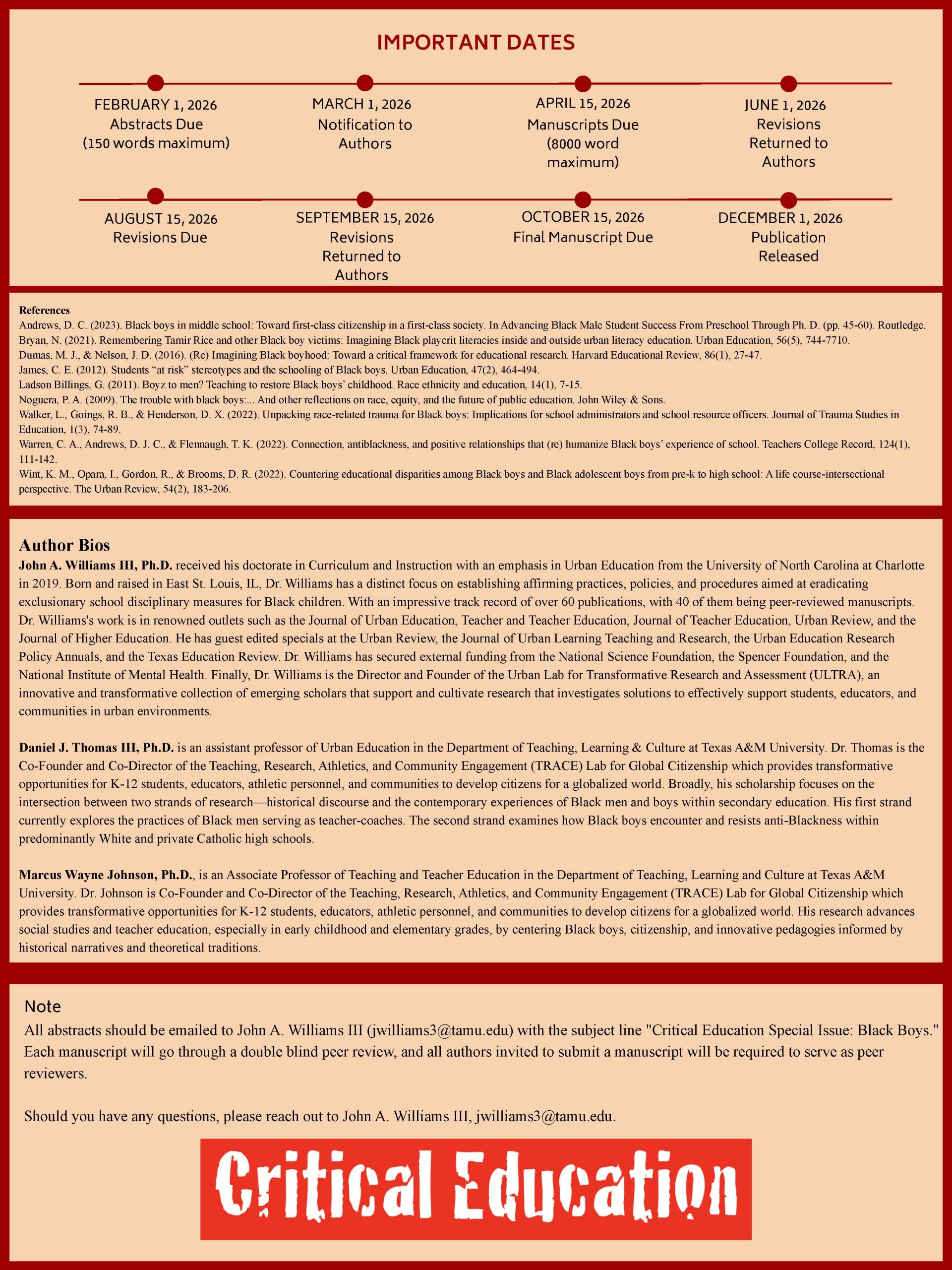 All abstracts should be emailed to John A. Williams III (jwilliams3@tamu.edu) with the subject line “Critical Education Special Issue: Black Boys.” Abstracts due: February 1, 2016.