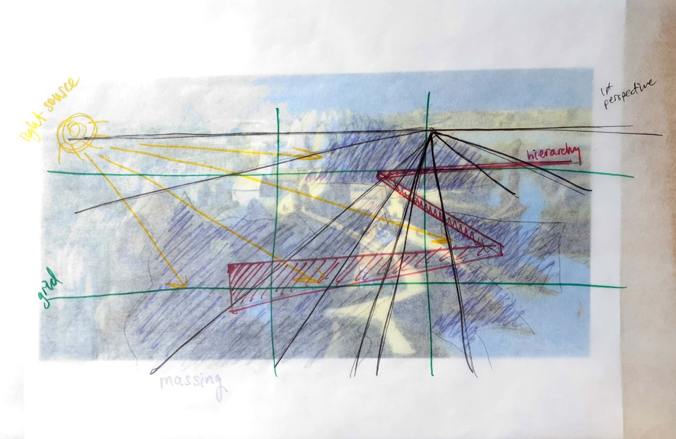 - Shape and composition of major visual elements (massing)