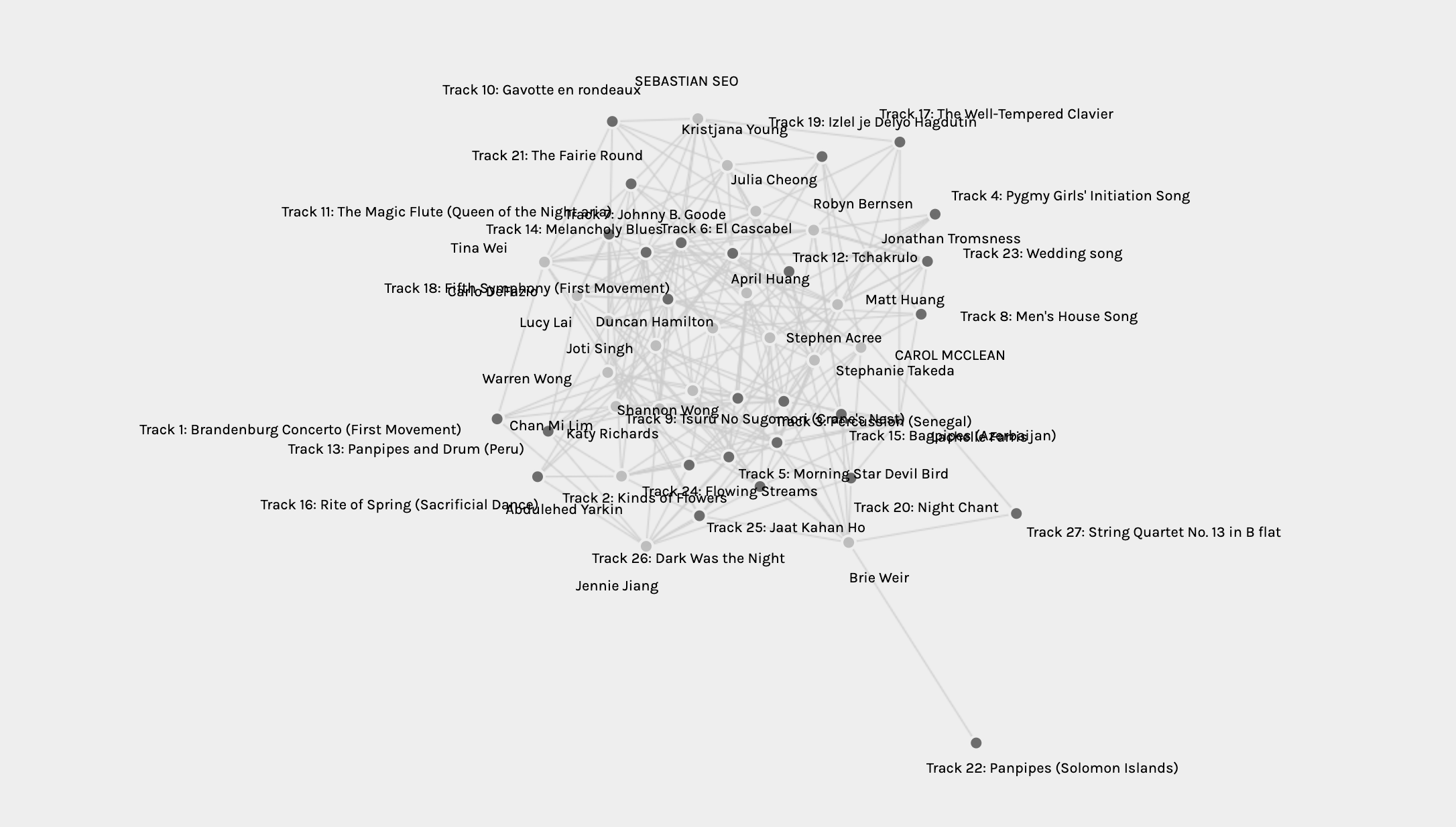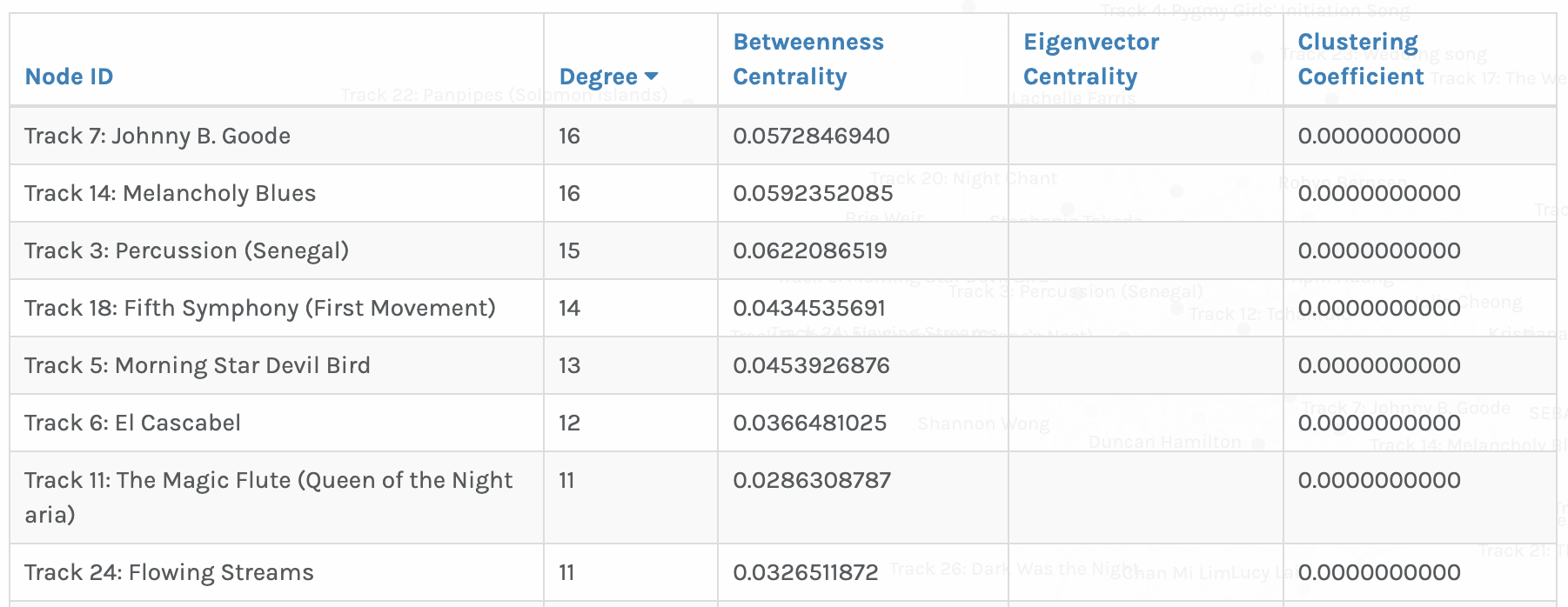 I was interested in finding out which songs were the top choices in the class. When looking at the curated tracks, I noticed that Johnny B. Good and Melancholy Blues were popular choices with a high degree of connectivity. They both had 16 picks. I thought perhaps it is because these songs are familiar to us and are big influences in the music scene in North America. To me, this would be a big factor in our connectivity because our geographical location and proximity would play a part and influence our musical selections. But do I truly know the reasons behind the choices of my peers? No. I can only guess or assume to the best of my knowledge why these songs were favored by my peers. Only they would be able to answer why they made that particular choice. This is important because it demonstrates that although a strong connection is illustrated, the reasoning and story behind these connections are missing.