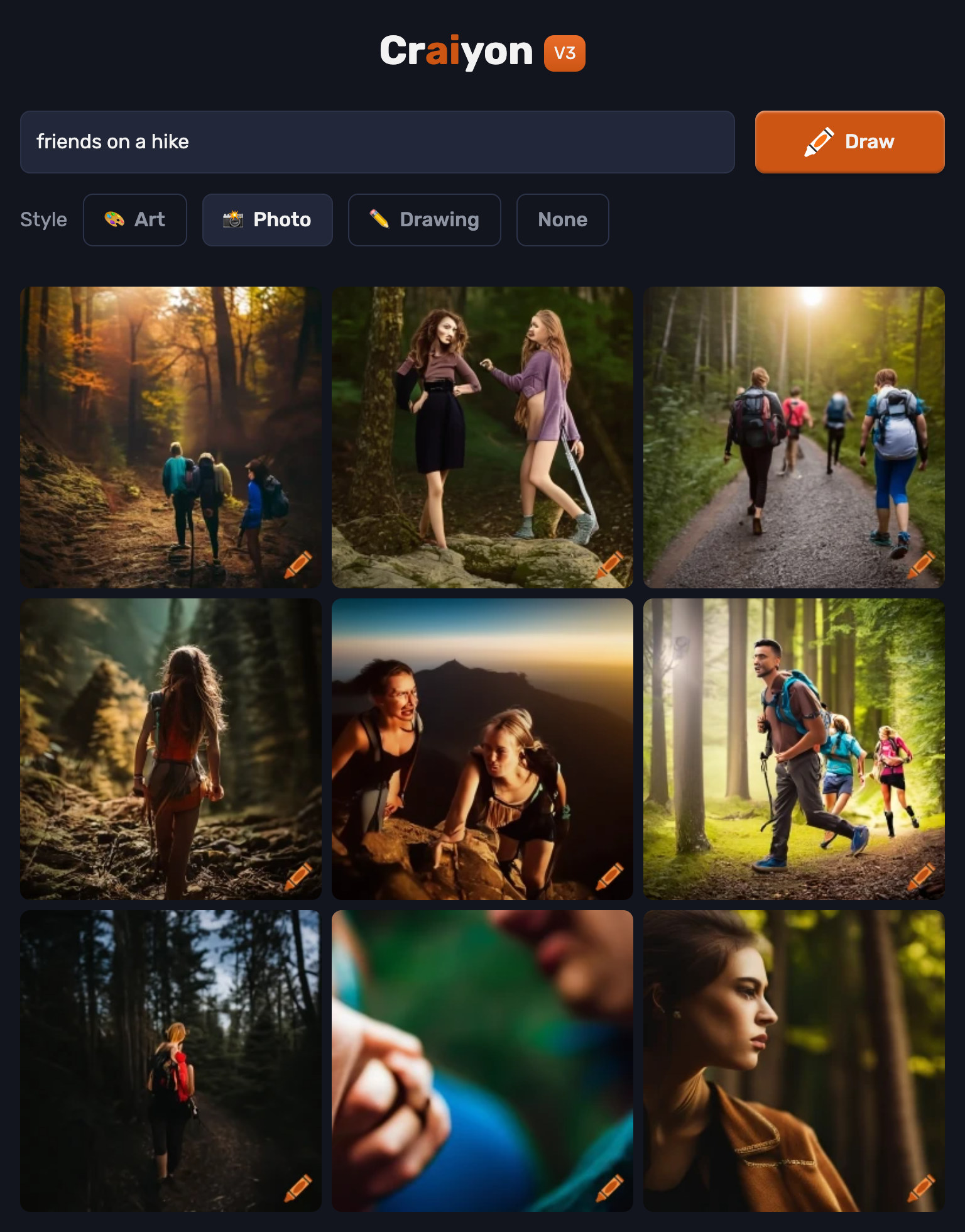 This week I had the opportunity to explore Craiyon. I have used other text-to-image platforms such as Adobe Firefly and Open Art AI to create images before and I was curious to experience this one. It was my first time using Craiyon. I really liked that Craiyon allows users to use the tool without providing any form of personally identifiable information or account creation because often data and privacy concerns are considered when using generative AI tools. While I can see that this platform can be intuitive and easy for individuals to use, particular things stood out to me that are worth noting which I will discuss in more detail below. I went on a hike with my friends recently, so I was inspired to use that as the initial prompt.
