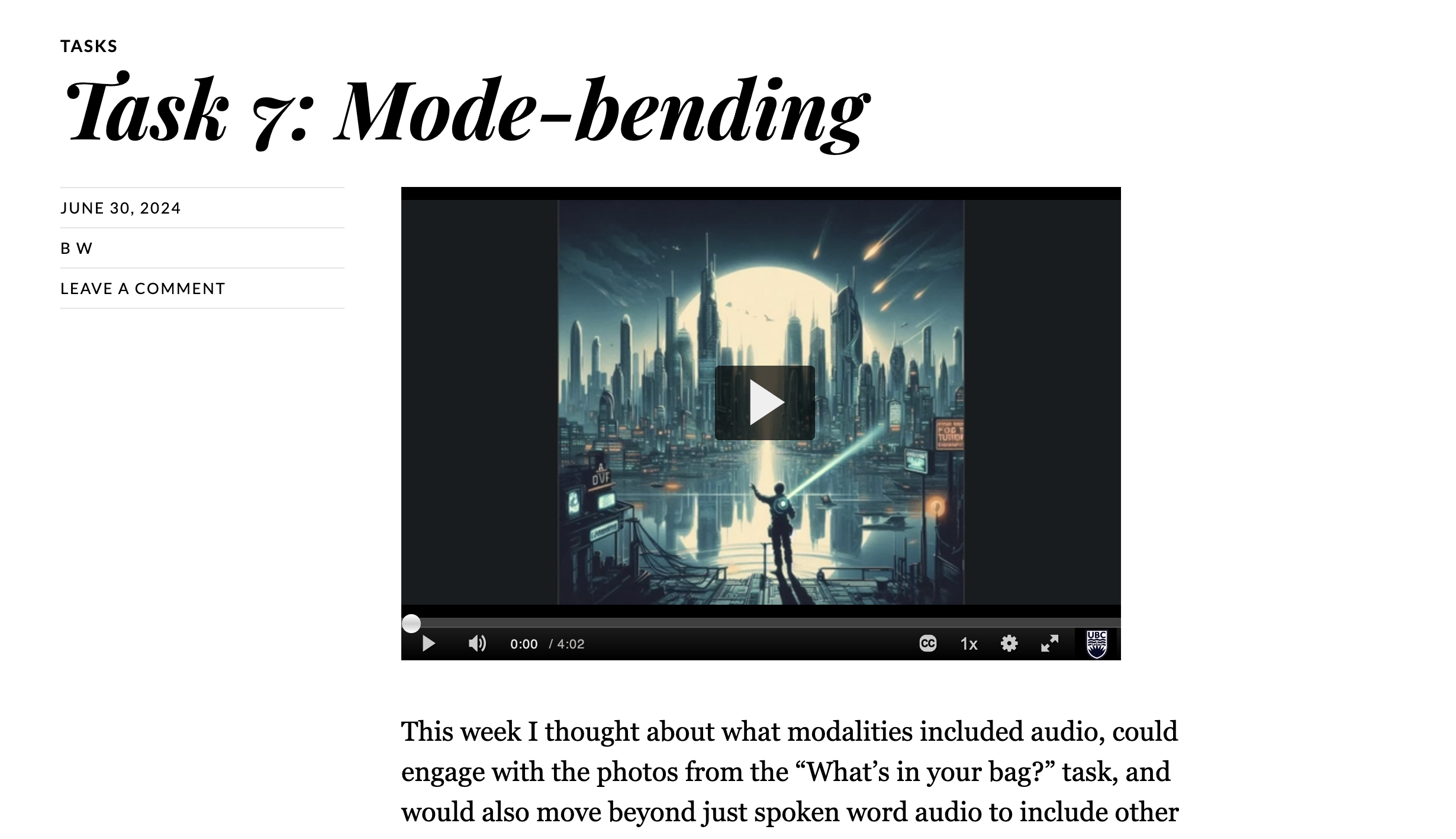 In her post, Brie chose to utilize the latest generative AI technology to create a podcast episode to share and present the contents of “What’s in her bag?”. I was particularly impressed with her take on setting this podcast episode in the future and she was the “thawed” guest who was there to share stories and perspectives. She did a spectacular job of integrating different technological applications that assisted in creating the music, script, and even the AI-generated voice for the host. It has inspired me to try these applications as well. This podcast format provided an easily digestible way for listeners to understand what life might be like in the “past” and how we go from one place to the next with all the items and necessities that we need. As she noted, she wanted to create a visual, audio, and linguistic artifact and she did just that.