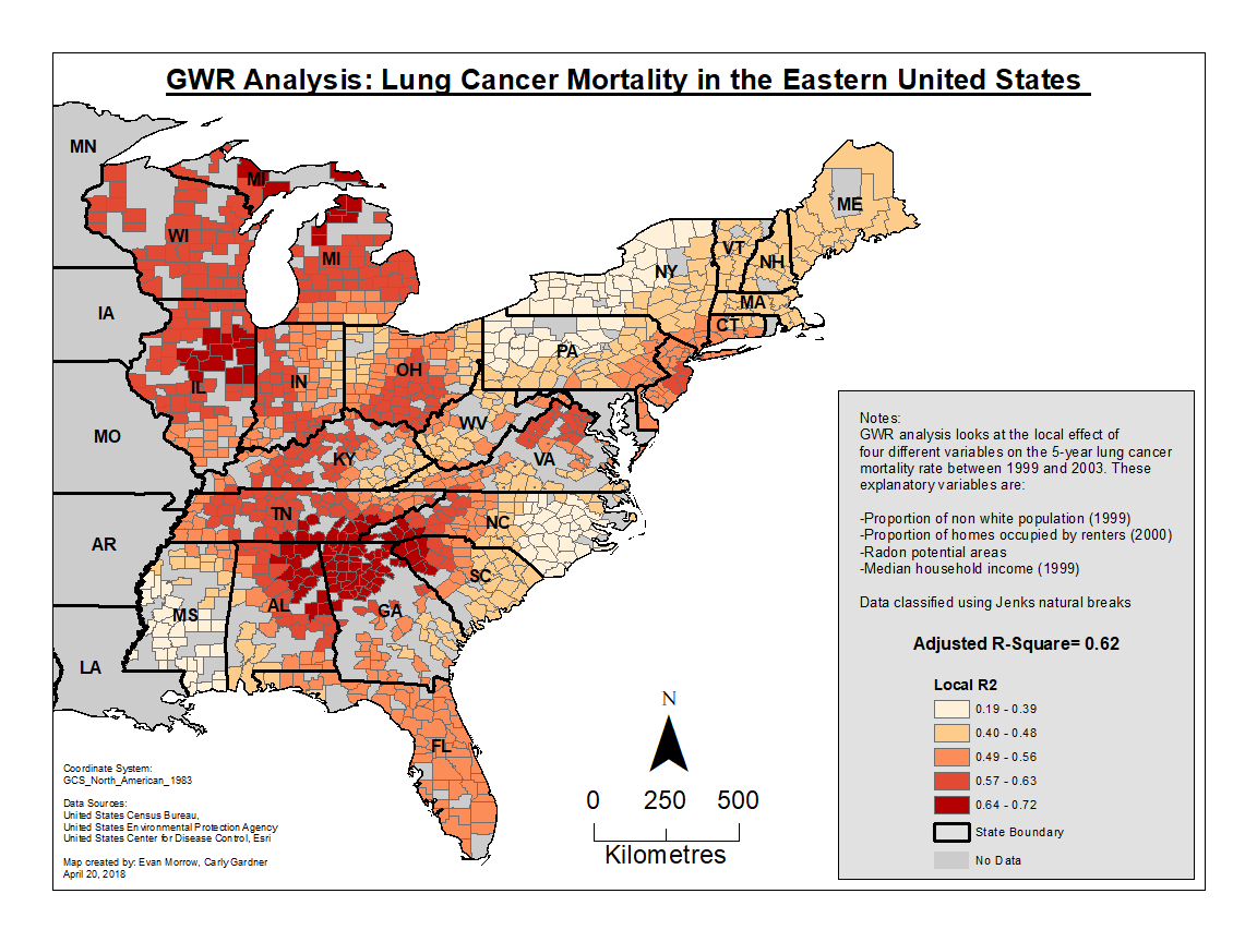 Geographically-weighted regression models assign a greater weight to observations which are nearer to each particular feature location than to those which are further away, removing any spatial dependencies which might have been present in the residuals of the OLS (global) linear regression model. GWR also allowed us to map variation in regression parameters across space. The GWR had a higher adjusted R-squared value (0.62) than the OLS Models 1 (0.48) and 2 (0.54). Highest local R-squared values were present on the western side of the region (Figure 7.1), particularly in northern Georgia, northeastern Alabama, and Tennessee (0.64 – 0.72). Medium-high local R-squared values (0.57 – 0.63) were identified in Wisconsin, Minnesota, and central Ohio. This area, which is best described by our GWR model, overlaps the south-central Appalachian subregion which exhibits multiple significant hot and cold spots for lung cancer mortality rates and explanatory variables such as income, smoking prevalence, proportion non-white population etc.