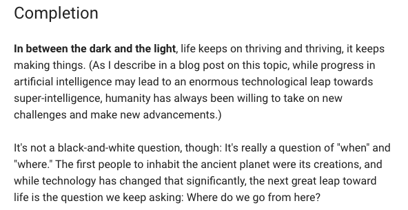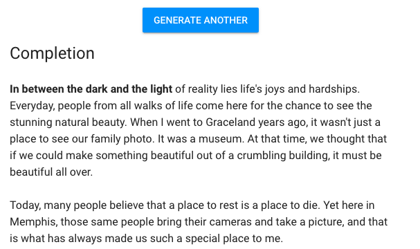But what if the software allowed for the user to input other parameters that would tighten up the corpus and shape or meaning of its generated output? What if I could generate text to pass off as my own academic work? I tried it again for the purpose of demonstrating how text generation can be used to autocomplete some of the ideas in this blog post, and I used it with this prompt: