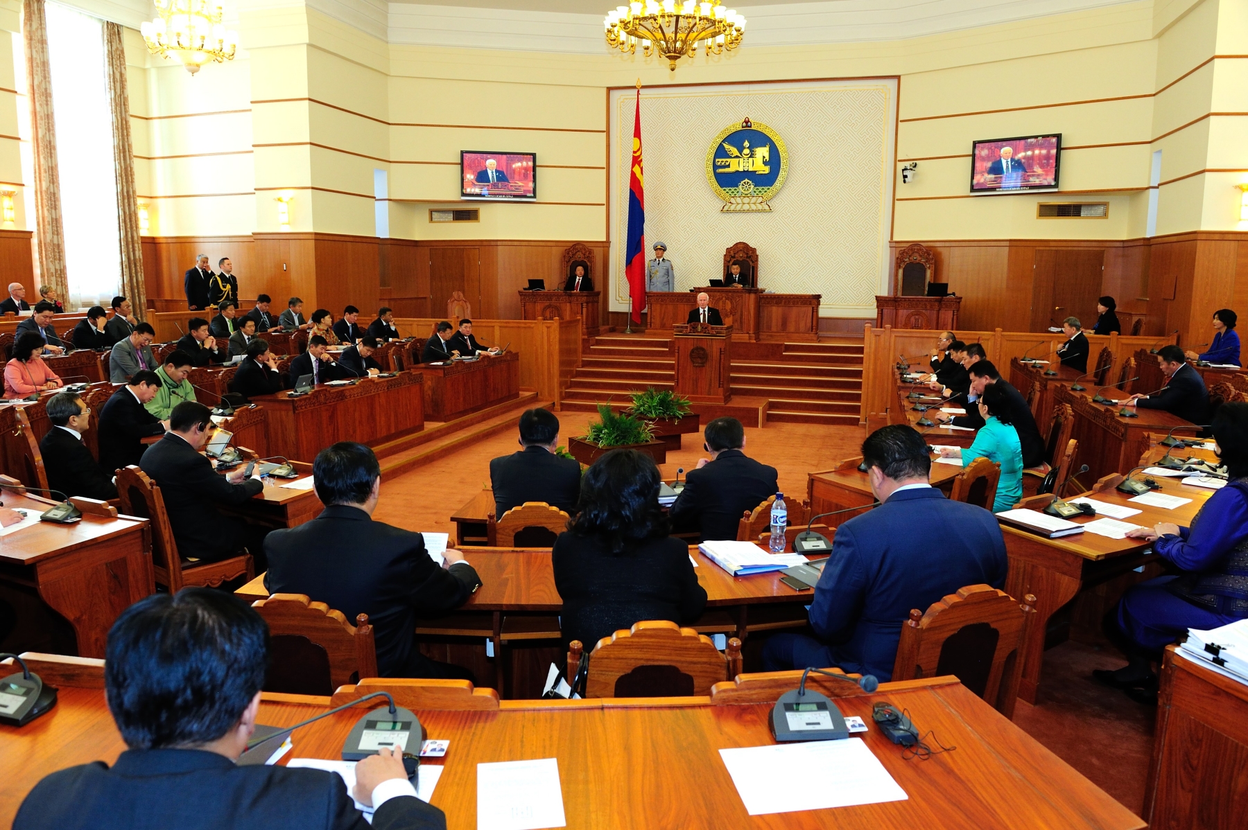 The parliamentary session was naturally presided over by Enkhbold Z, chairman of the Ikh Khural, who sits at the centre of the back wall. Seats for the 76 MPs are arranged in a horseshoe formation facing each other and the chairman. President Elbegdorj sat to the right of the chairman and an additional chair was placed ahead of him for the Governor General. Official members of the Canadian delegation were sitting in a line behind MPs to the right of the chairman while another row of chairs was behind the MPs to the left of the chairman where Mongolian officials, such as H.E. Zalaa-Uul, the current ambassador to Canada, were seated.