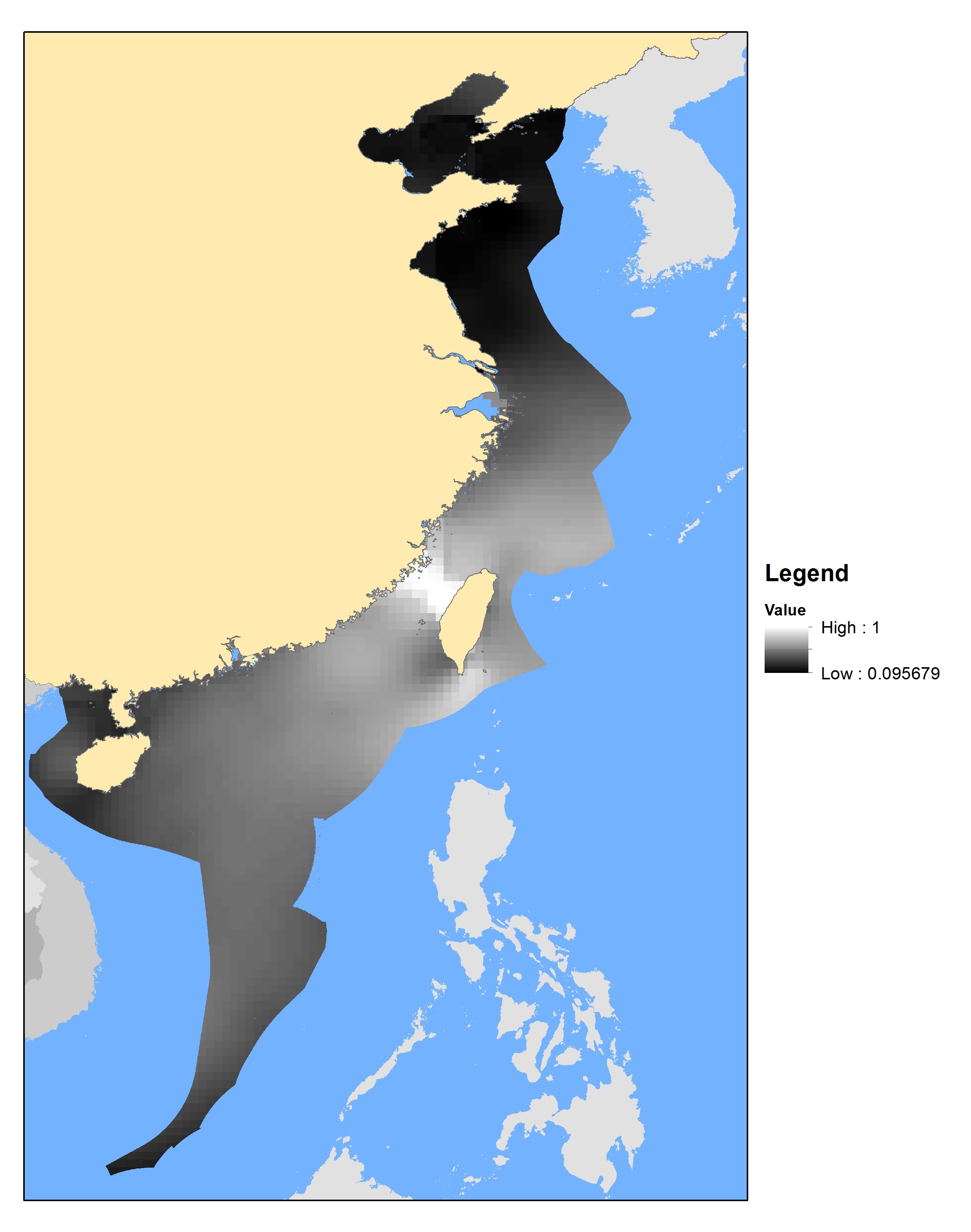 As for sea depth, our chosen maximum depths were at sea level (0m), we then determined the value of -12m as the minimum based on China’s expectations for installing the majority of wind turbines in the short-to-medium term in water depths no more than 12m (Carbon Trust, 2014). Therefore, we used the reclassify tool to limit the depths of our chosen values (0 for all excluded areas, and 1 for feasible areas) (Fig.8)
