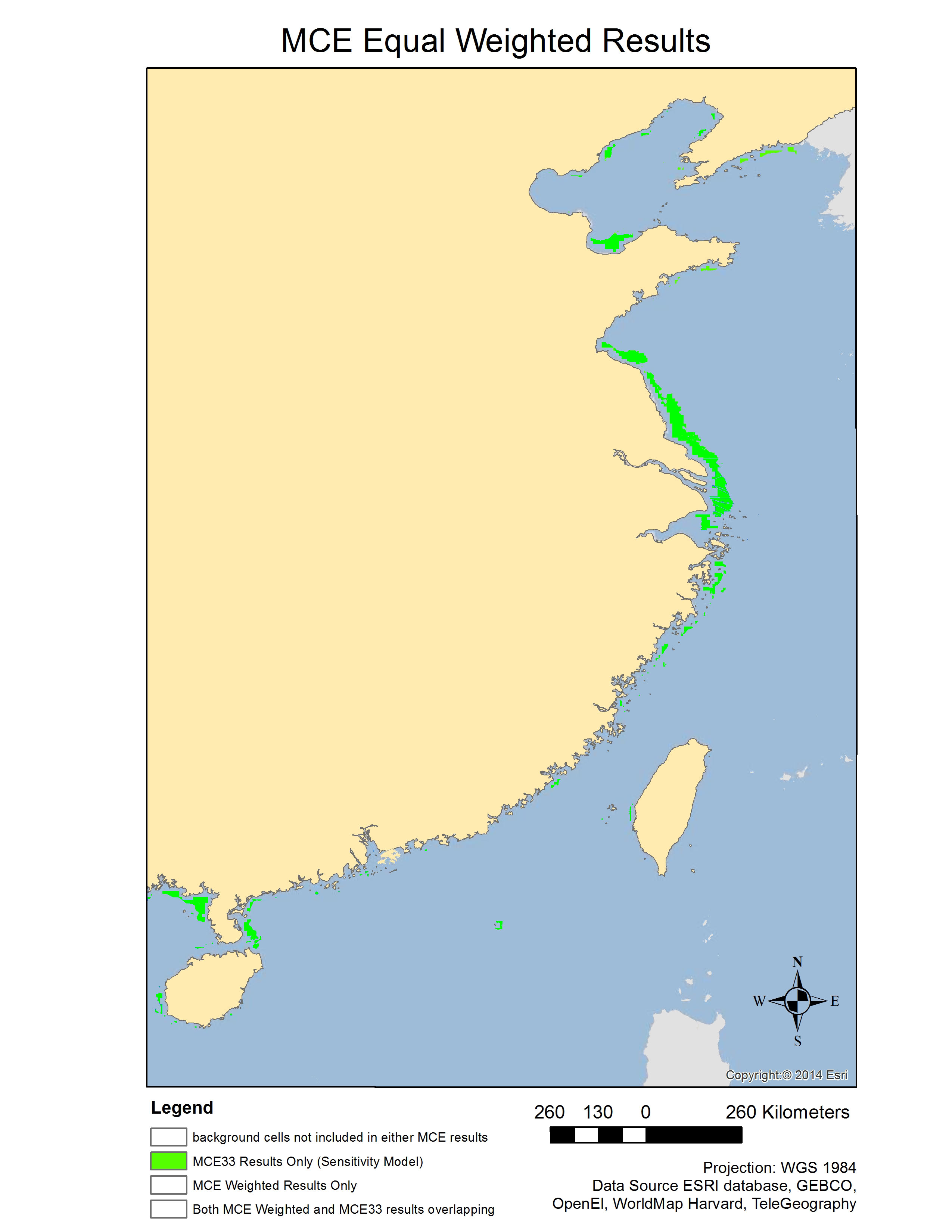 For the final constrained MCE model results (weighted), we see that it has the most potential sites found in China, with most of the sites concentrated the central shoreline of China (fig. 13). And for the final constrained MCE model where factors are assigned equal weights of 0.33 each, we see a noticeable change in the number of suitable areas. Most of the central areas are gone, while it has become concentrated in the northern shoreline of China (fig. 14).