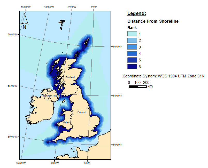 It is more economically feasible to build wind farms closer to the coast, and this means creating a distance- from-the-shoreline raster. This was created by buffering the UK shapefile by 12 nautical miles (the extent of the UK territorial waters) and thereafter increasing (and decreasing) the distance from the shoreline by 6nm (arbitrarily chosen). The final distances were: 0, 6, 12,18, and 24nm. The maximum distance was chosen because it is close to the average distance for offshore wind projects in Europe in 2015 (43.7km ~ 23.4nm) (Ho et al. 2016). The distances were then ranked 1-6 (higher rank = more preferable). All the distance polygons were merged and then converted into a raster (Figure 10).