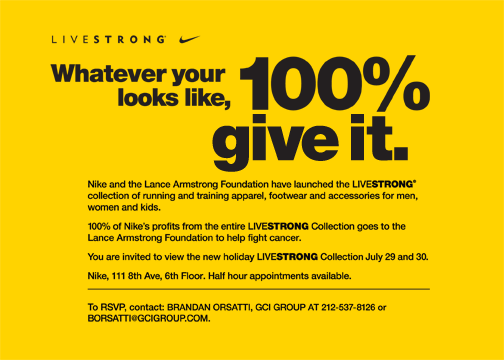 Beginning in 2008, Nike and Lance Armstrong are bringing the LIVESTRONG Collection of workout and running apparel and footwear to retailers nationwide. In an unprecedented move, 100 percent of Nike’s profits from the entire LIVESTRONG collection will go to the Lance Armstrong Foundation (LAF), a foundation that fights cancer.