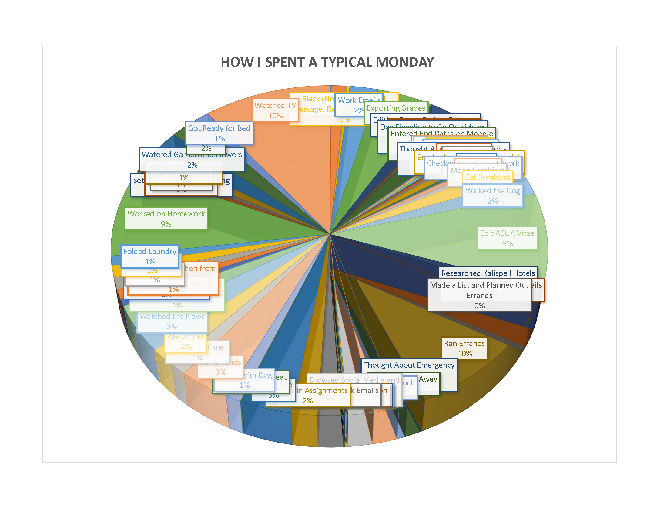 I purposely created a pie chart with all of the tasks I completed on this Monday. It looked messy but I thought, there was no better way to depict the organized chaos (or multitasking) events that took place throughout my day. I was curious how I spent my day, so I tried to categorized the tasks I completed and found it interesting that a big part of my day was spent caring for Buckley; I wasn’t surprised that work and school tasks occupy a lot of my time as well. The tasks that don’t take a lot of time – checking phone notifications and scrolling social media, are distractions or multitasking events that I performed while completing a primary and secondary task. I’m also very aware, that I likely did not track every single “thing” that I was paying attention to. Last, I wanted to get an idea of how much time I spend multitasking vs focusing on one activity; I am not surprised that the majority of my day is spent multitasking.