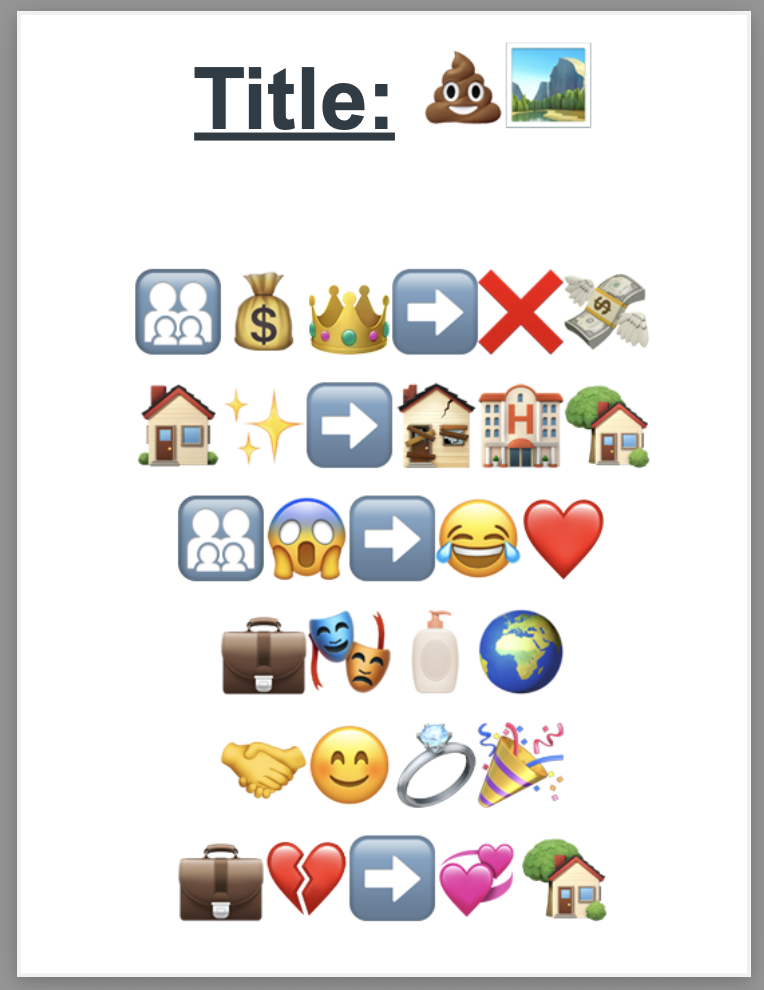 I started with the title. I found it to be the easiest entry point and approached it with a more literal translation. Beginning with the title helped spark creative ideas and made me feel more comfortable as I moved on to describing the plot in emojis.