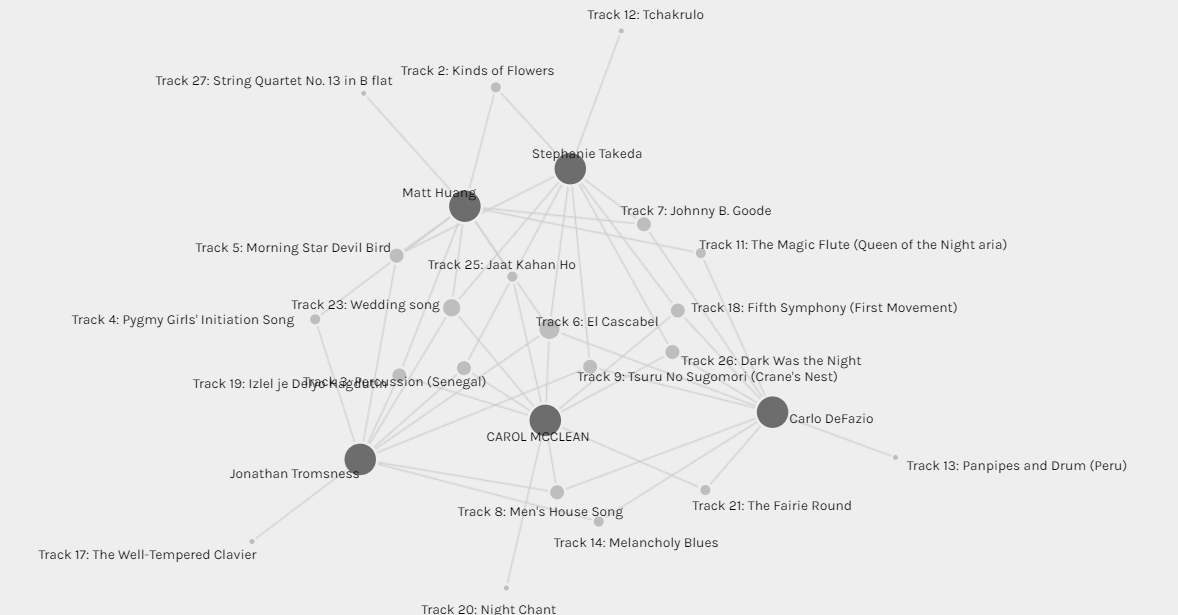 For instance, we lack the rationale behind the choices made (or not made). Without this information or additional context, it’s easy to assume that all song choices were based on similar reasons, potentially skewing interpretation. For example, without understanding the task behind this visualization one might assume our group is unified by a shared love of mariachi music and try to cater to our group in that way, or worse yet try to exclude others who don’t “like” mariachi music.