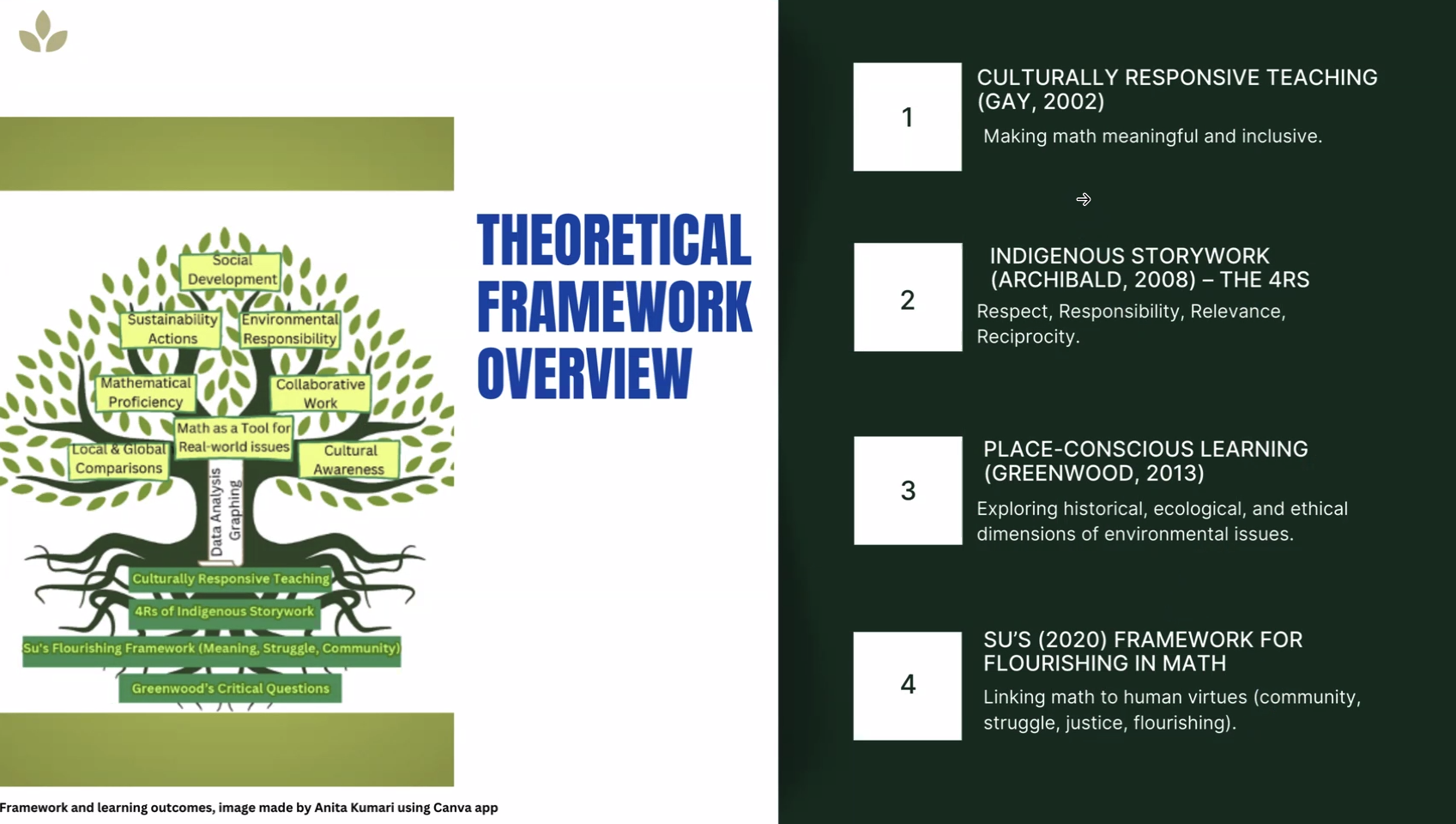 On March 11, 2025, Anita Kumari shared with the SyMETRI group of her recent project integrating cultural storytelling, mathematics, and environmental awareness to engage Grade 6/7 students in exploring deforestation and sustainability. The project showcased active participation in a Vancouver School District classroom and a community center, illustrating how cultural stories can motivate environmental care and math learning.