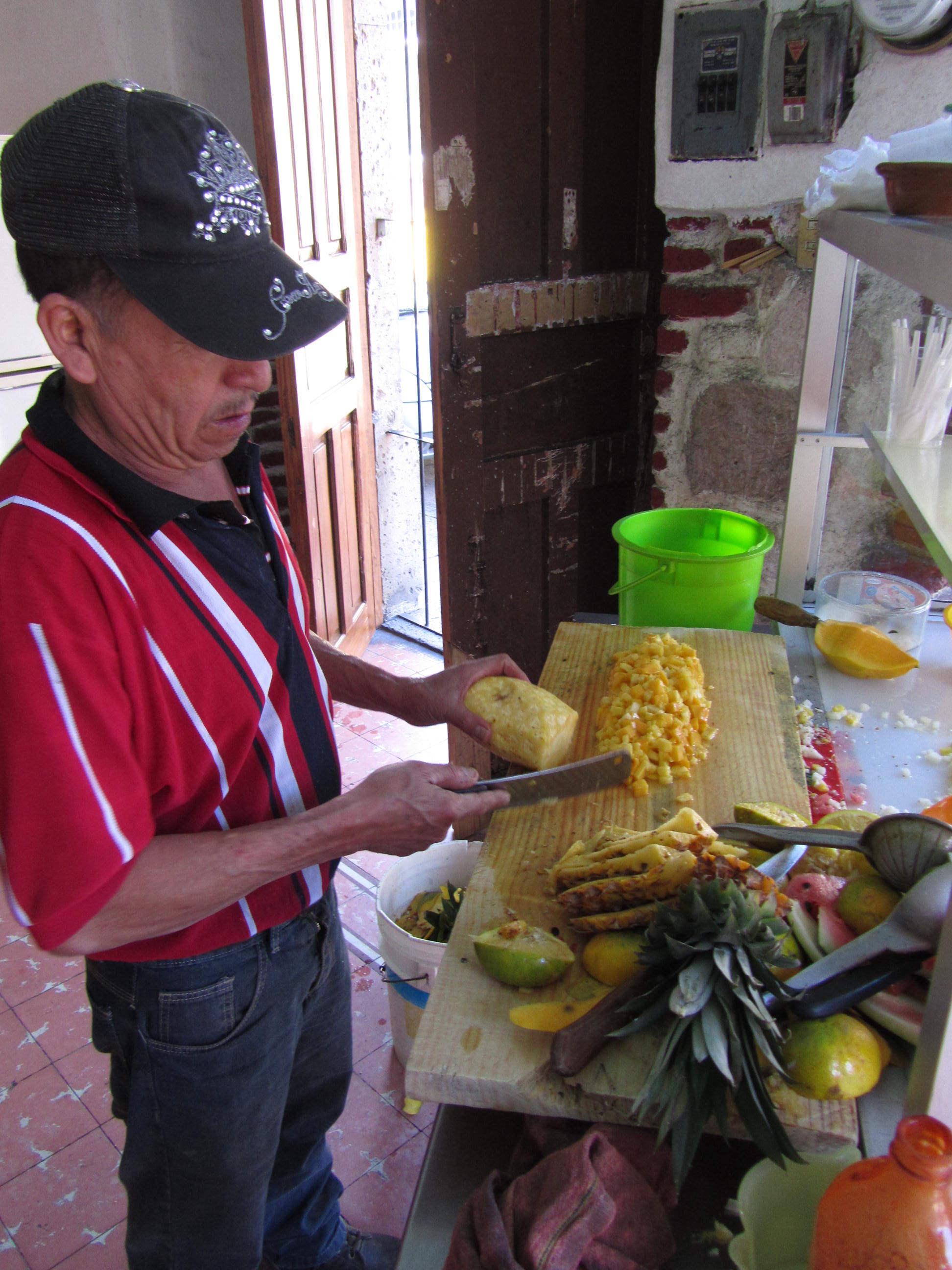 - Gazpacho. I know, people back home think of cold tomatoe soup when I say gazpacho but in parts of Mexico, gazpacho is finely cut fruit (I personally like mango and pineapple). In Moroleón, not where this photo is taken, they also add orange juice and cheese, as well as the usual chili and salt. I am a gringa and take mine simple. Just the fruit please!